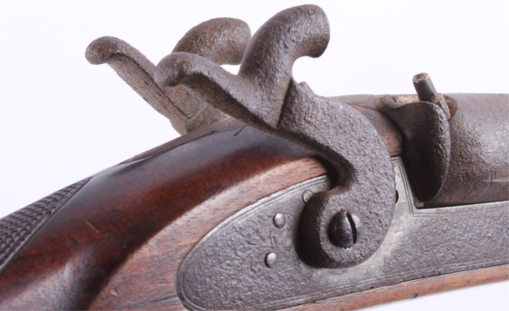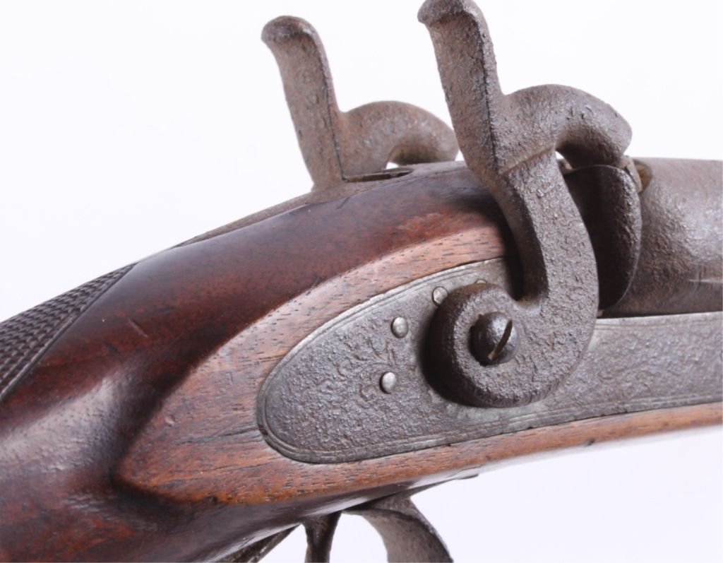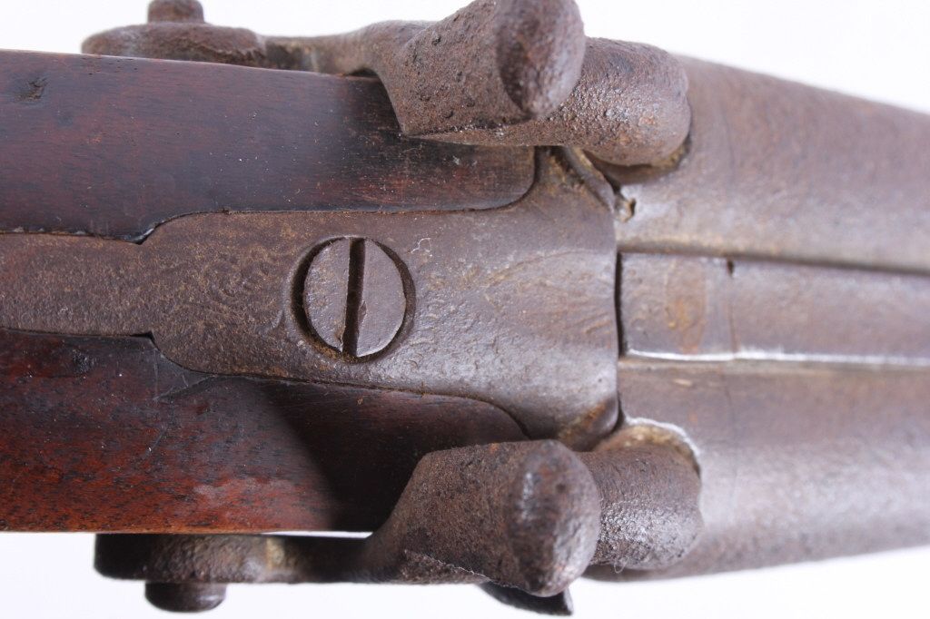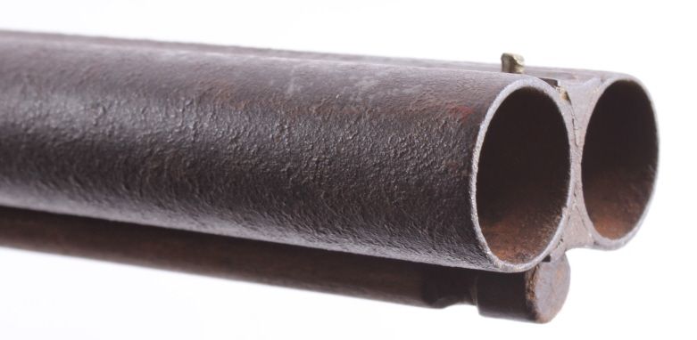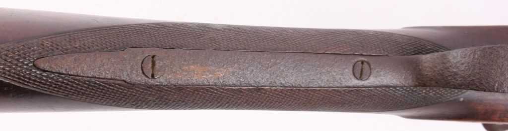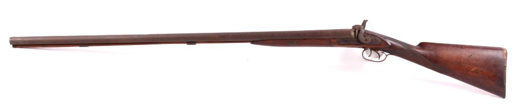 This is a double barrel 10 gauge English percussion shotgun circa 1860’s which is a Richards. The top of the barrels normally is marked “LONDON FINE TWIST”, but has worn off. This is a very early firearm showingpitting across all the metal, but a great piece for being around 160 years old. This piece could have been used in the Civil War by the Confederates. The inside of the barrel measures 35" long and comes with the ramrod.