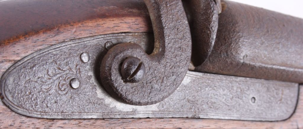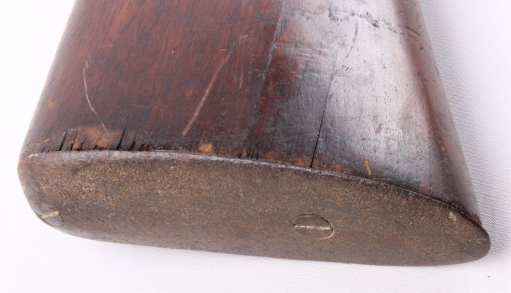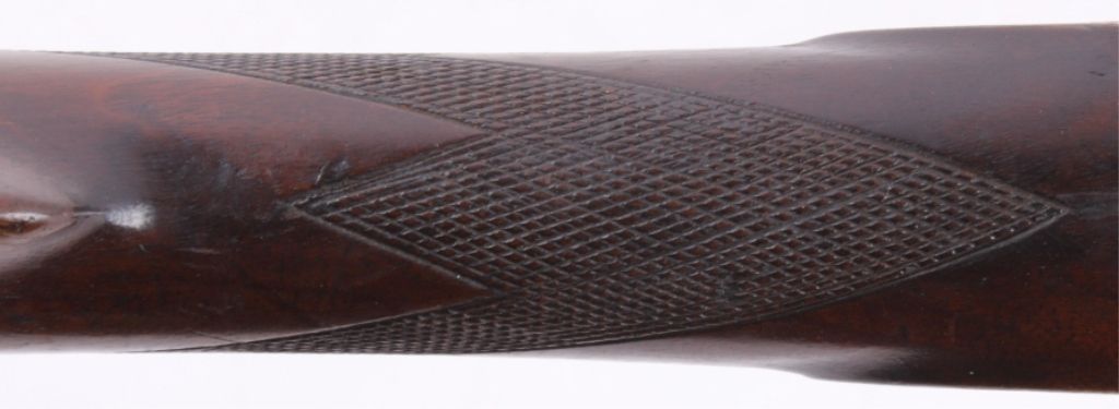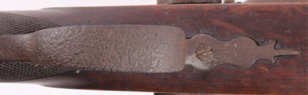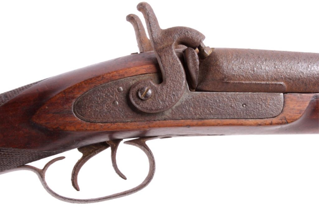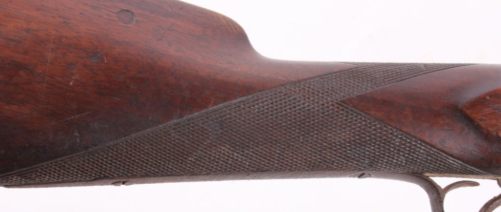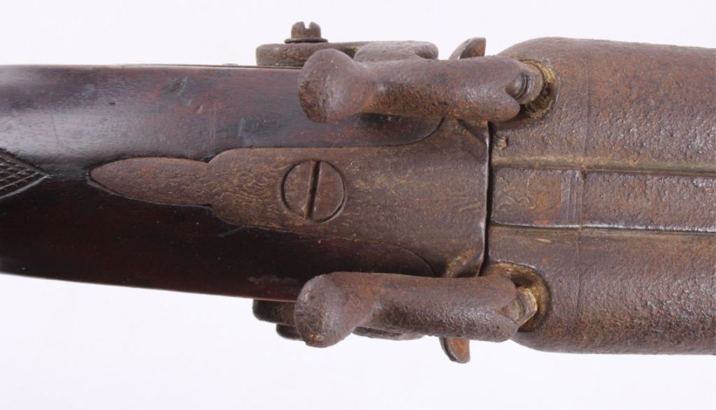 This is a double barrel 10 gauge English percussion shotgun circa 1860’s which is a Richards. The top of the barrels normally is marked “LONDON FINE TWIST”, but has worn off. This is a very early firearm showingpitting across all the metal, but a great piece for being around 160 years old. This piece could have been used in the Civil War by the Confederates. The inside of the barrel measures 35" long and comes with the ramrod.