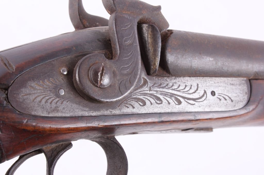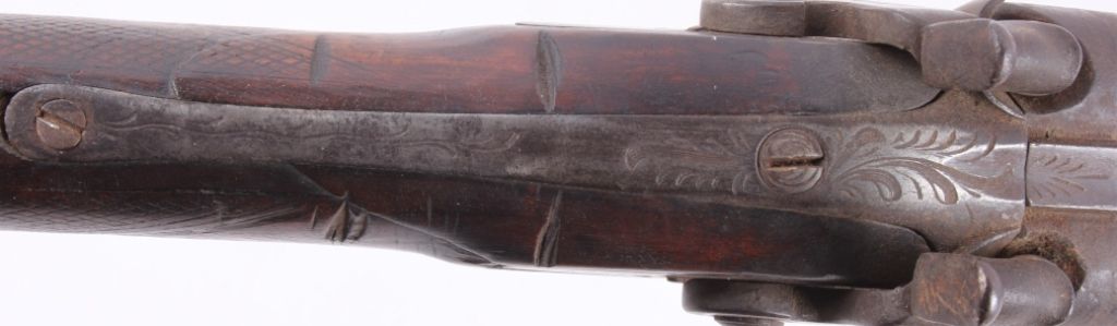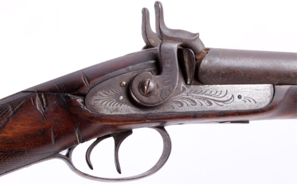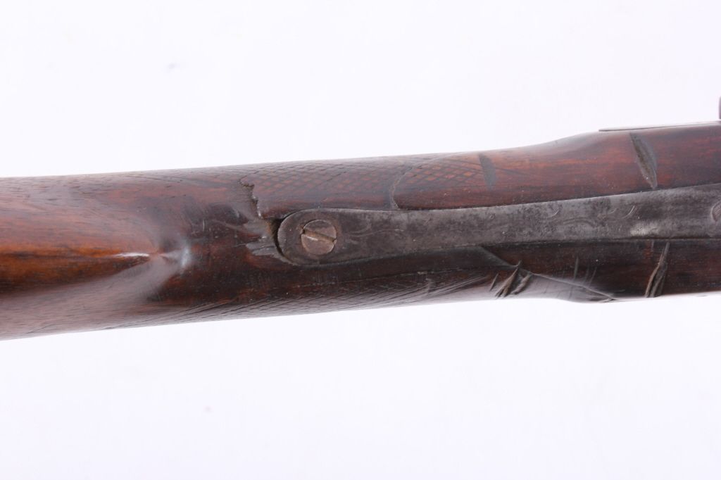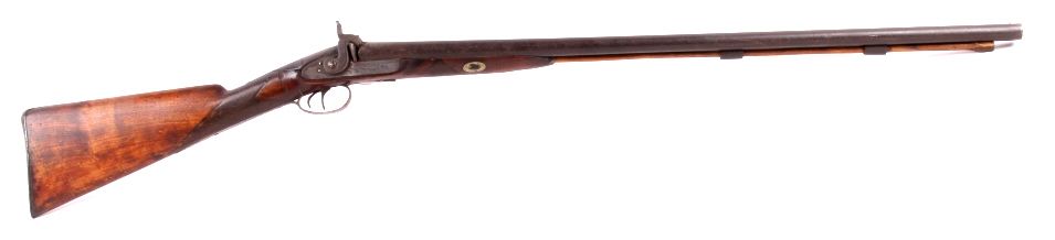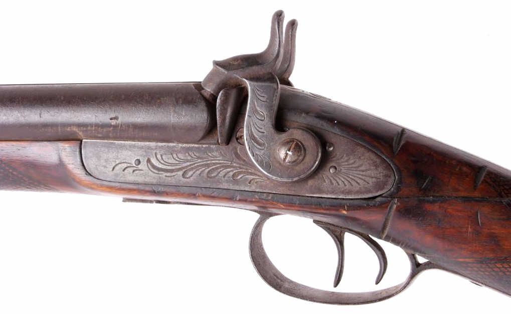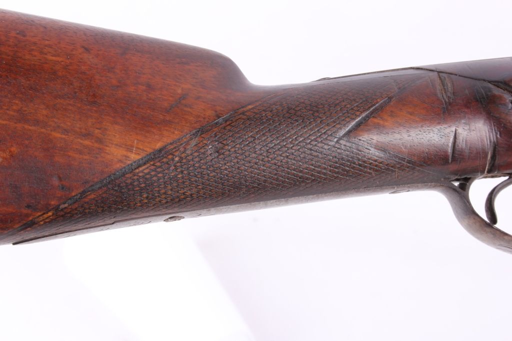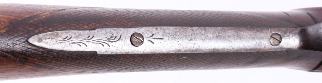 This is a double barrel 10 gauge English percussion shotgun circa 1860’s which is a Richards. The top of the barrels normally is marked “LONDON FINE TWIST”, but has worn off. This is a very early firearm shows little tono pitting on the barrel and deluxe checkering and hand etchings across both locks and across the top, and is a great piece for being around 160 years old. This piece could have been used in the Civil Warby the Confederates. The inside of the barrel measures 31" long and comes with the ram rod.