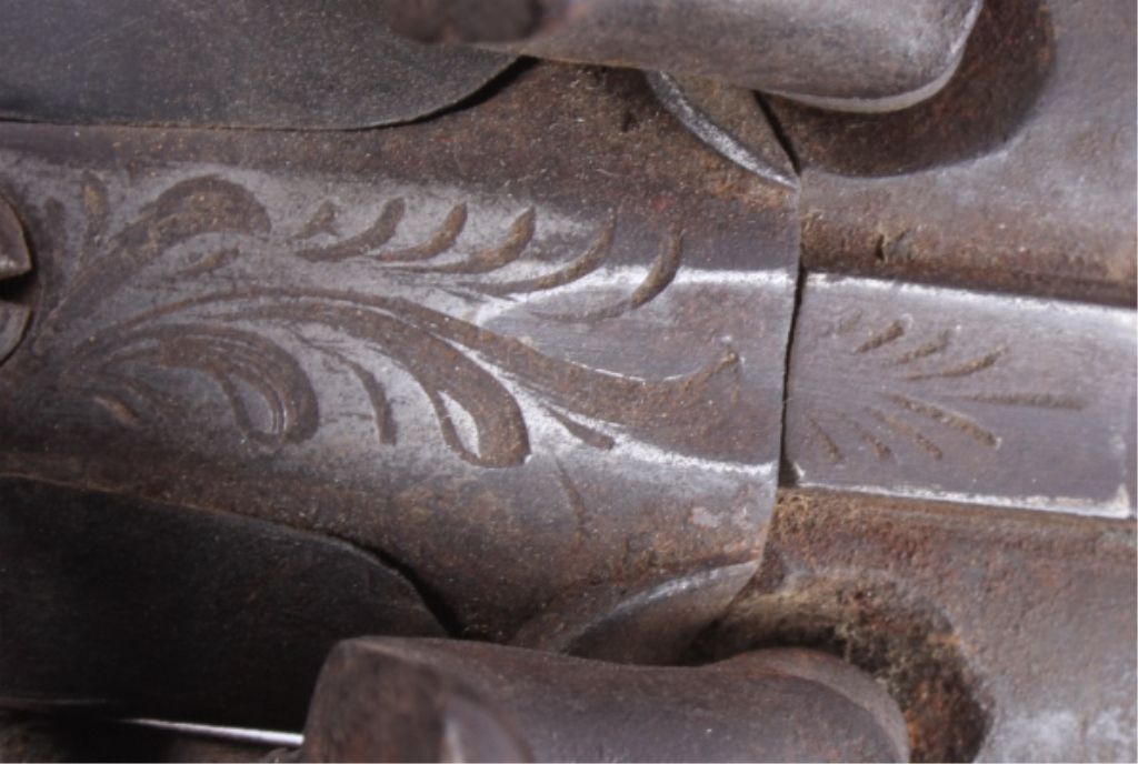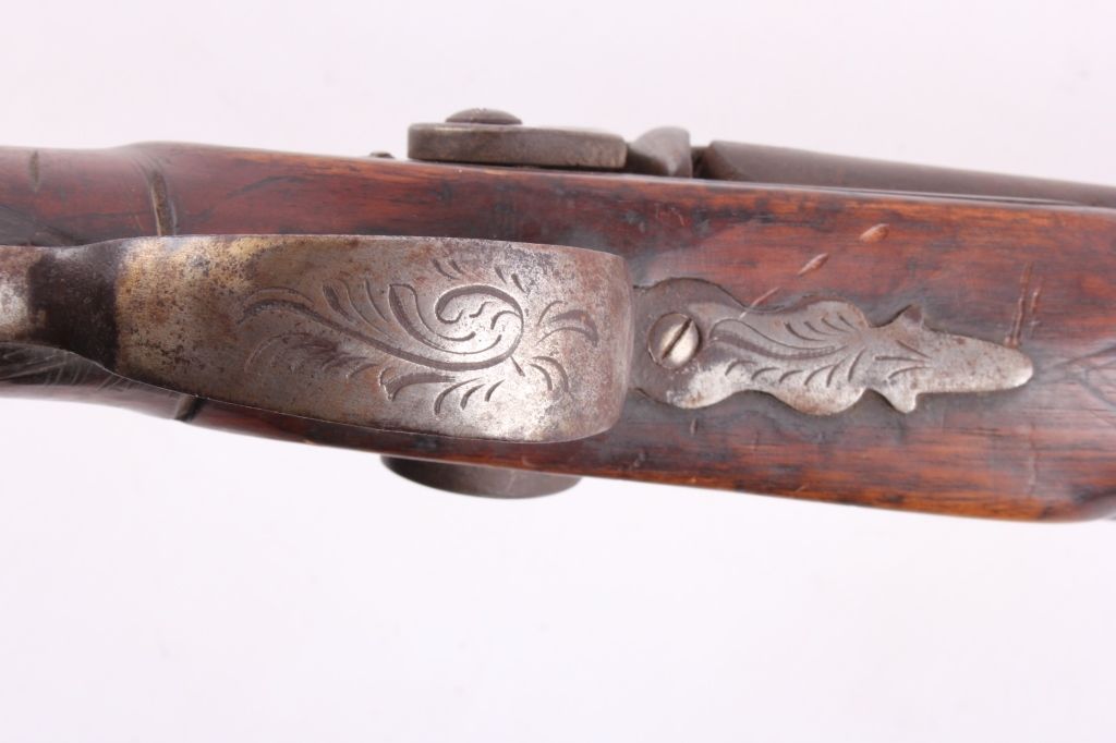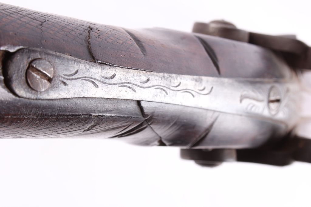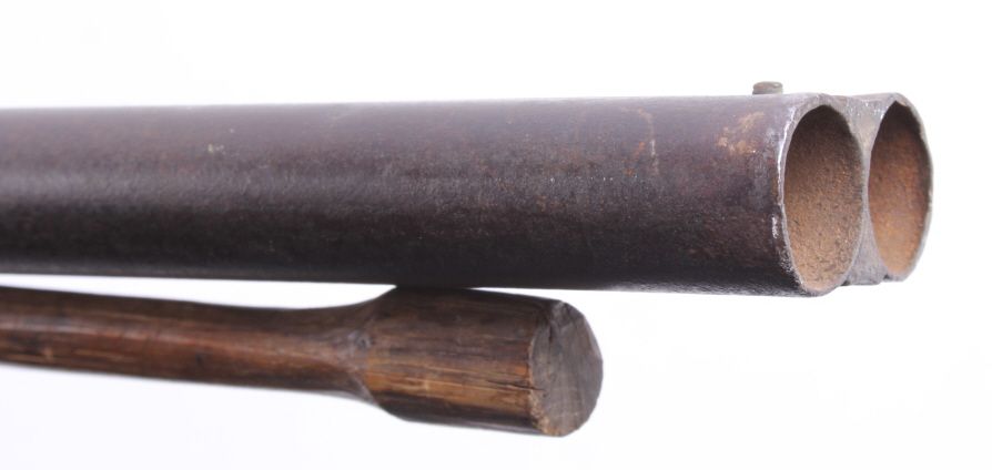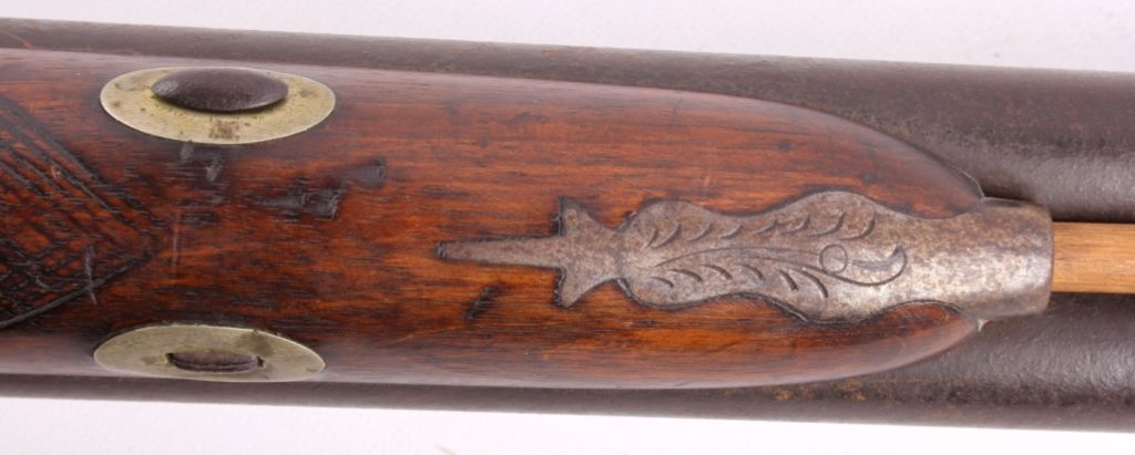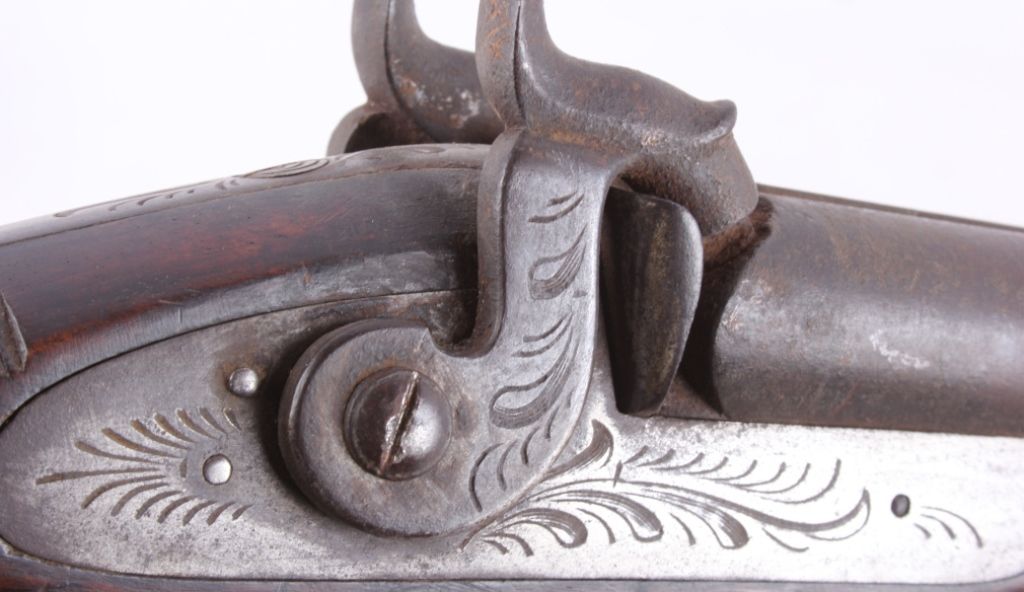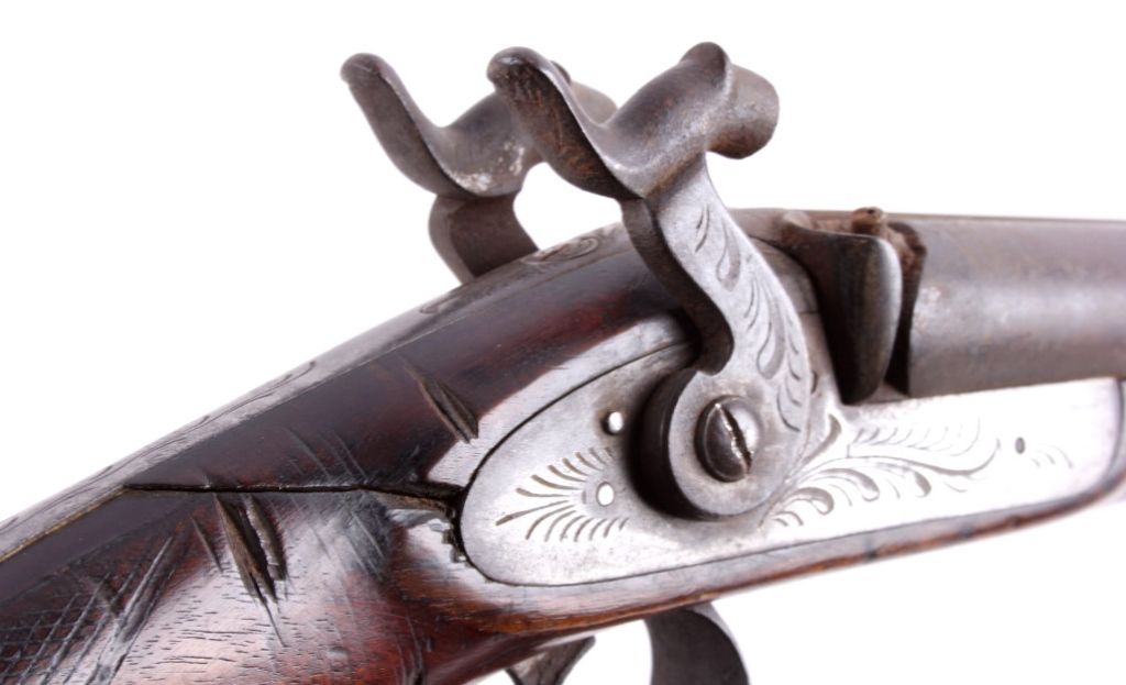 This is a double barrel 10 gauge English percussion shotgun circa 1860’s which is a Richards. The top of the barrels normally is marked “LONDON FINE TWIST”, but has worn off. This is a very early firearm shows little tono pitting on the barrel and deluxe checkering and hand etchings across both locks and across the top, and is a great piece for being around 160 years old. This piece could have been used in the Civil Warby the Confederates. The inside of the barrel measures 31" long and comes with the ram rod.