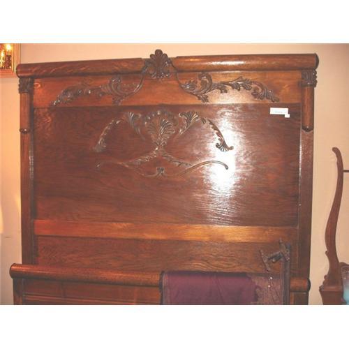 Beautifully Carved Oak 3/4 Bed, circa 1860. Headboard, footboard and side rails. Headboard stands 6' tall with rounded top and panel back. Upon panel are applied wood decor showing fan and leaf design. Footboard is plain with rolled top.