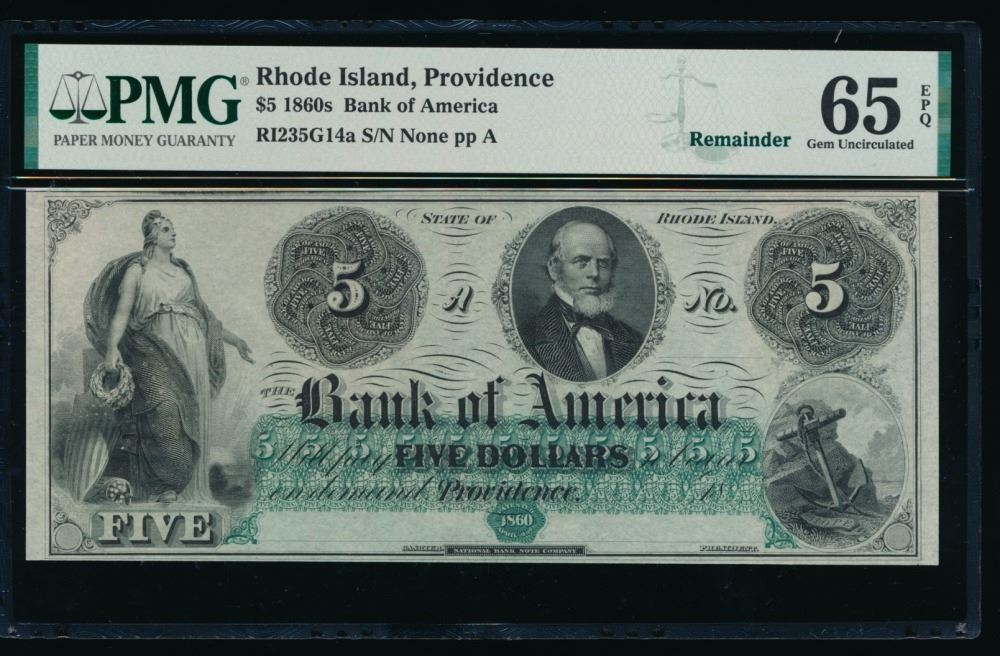 One 1860s $5 Providence RI Obsolete PMG 65EPQ.