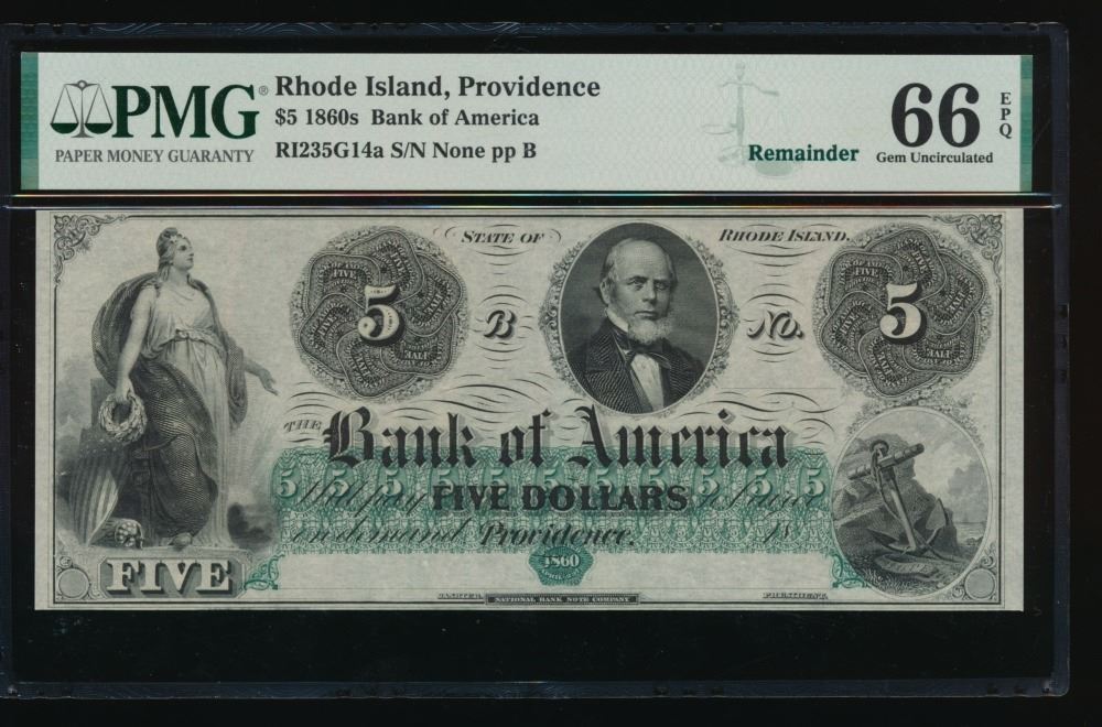 One 1860s $5 Providence RI Obsolete PMG 66EPQ.