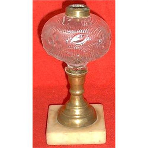 This Early American Pattern Glass colorless oil lamp is the Periwinkle Pattern made around the 1860s. Soon to celebrate its 144th birthday, it is in excellent condition. There are no chips or cracks to the Font. The marble base has some very minor wear. It is right at 8" tall and the base is about 3 1/2" square and is all original. I bought this from a person I have been buying alot of pieces from in the last few months. All the items have been stored since the 1940s when his grandmother closed her antique shop in NJ and moved to Florida. It had never been unpacked or rewrapped until he brought it in in the original 1940s newspaper. Everything I have bought has been from the mid 1800s to early 1900s. Most of it mid to late 1800s. There is absolutely no doubt about this rare and wonderful piece.