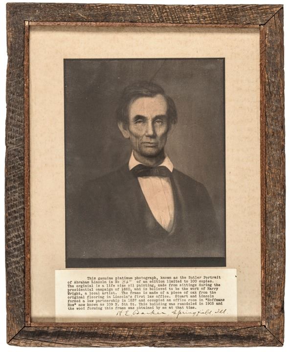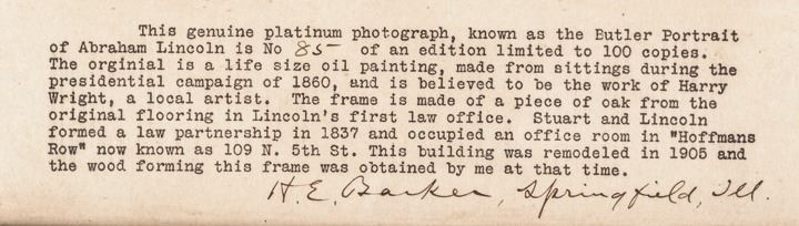 This is a rare large size Platinum Photograph by H.E. Barker, of George Frederick Wright's Butler Portrait of President Abraham Lincoln. Framed with reclaimed wood from Lincoln's first law office, and includes a small descriptive paper in the framing, detailing the historical relevance of the original portrait. Reads in full: “This genuine platinum photograph, known as the Butler Portrait of Abraham Lincoln is No 85 of an edition limited to 100 copies.