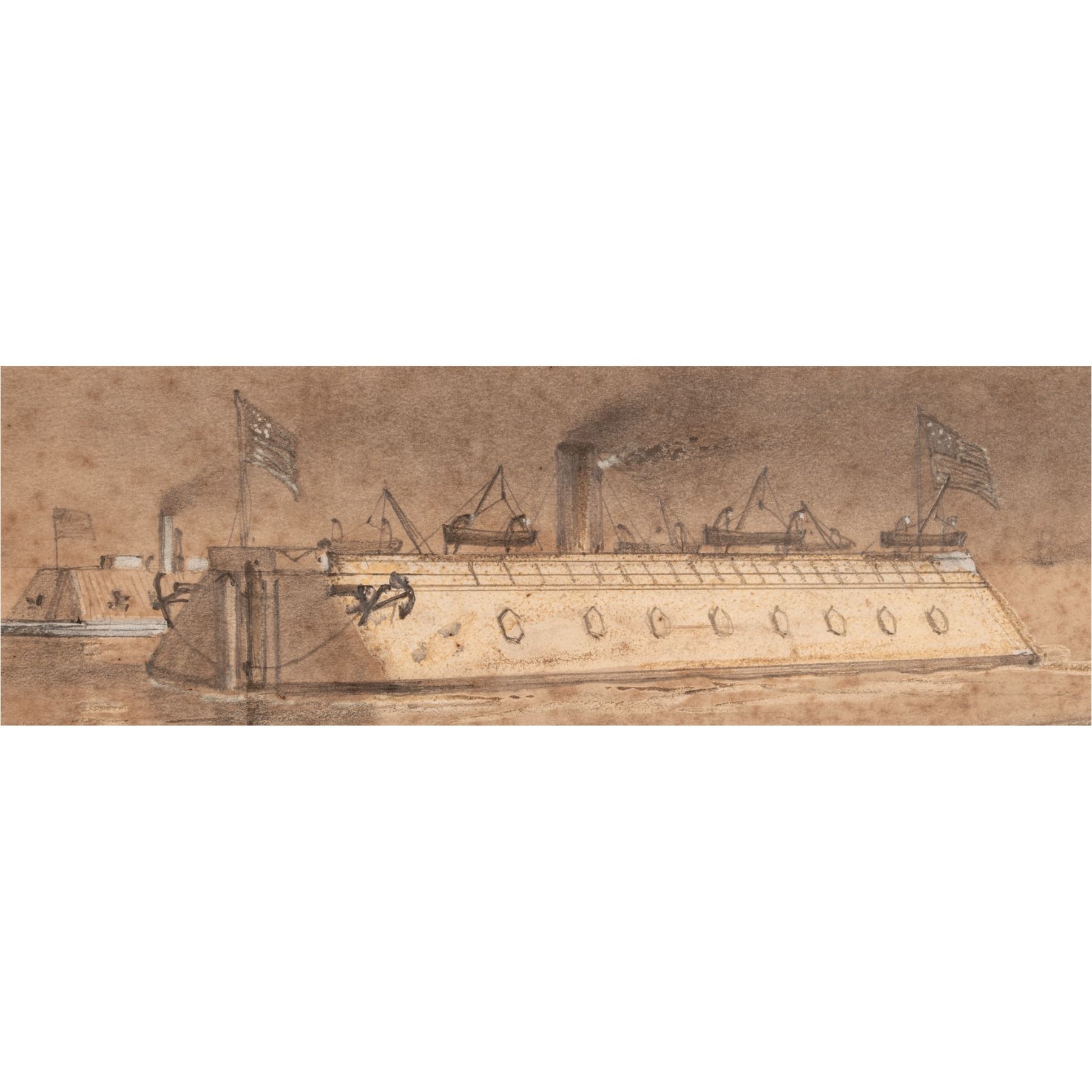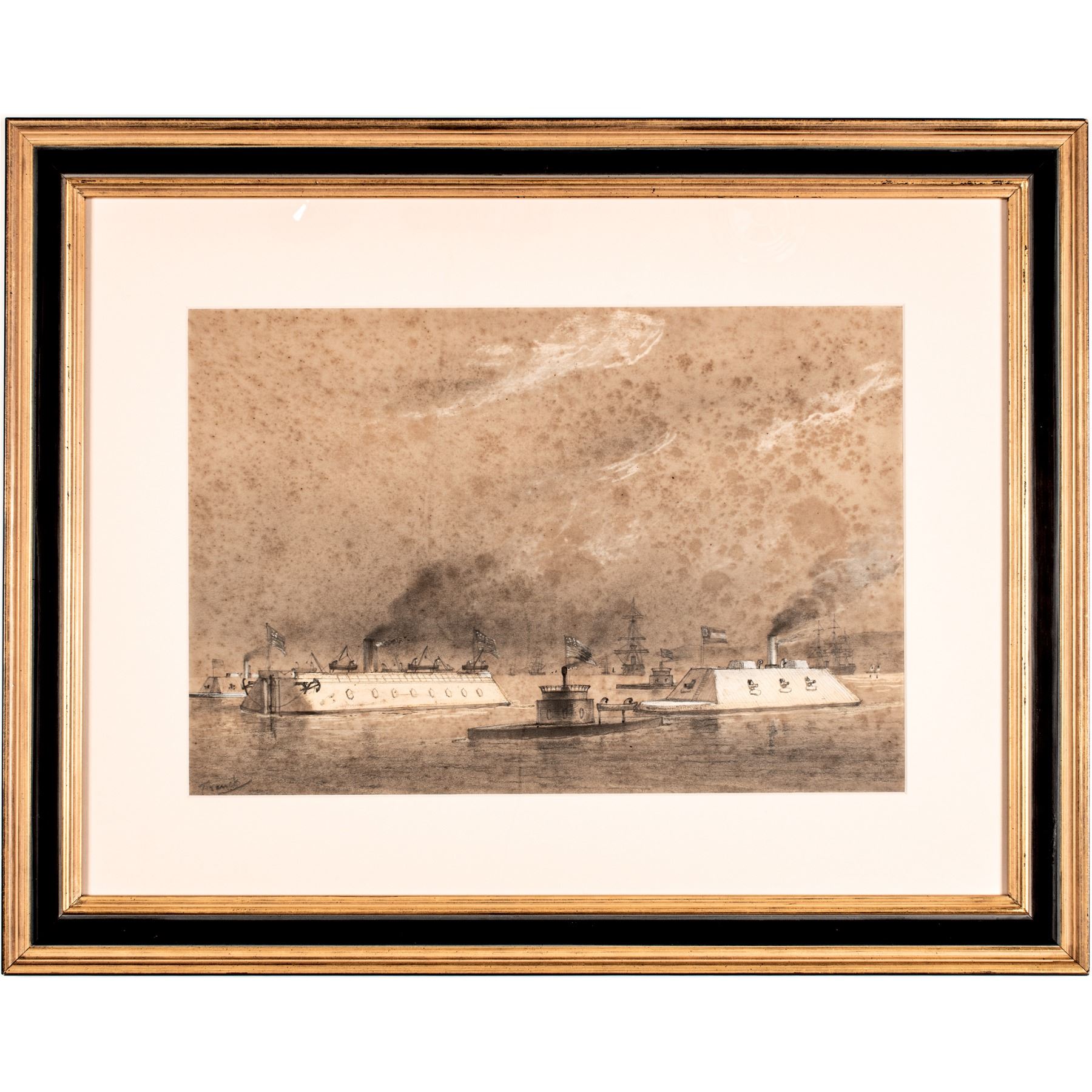 (c. 1860s Civil War), Original Artwork Chalk on Board, Drawing of Union and Confederate States of America Flagged Navy Ironclads and Rams, Artist Signed “Franck,” Framed, Choice Extremely Fine.