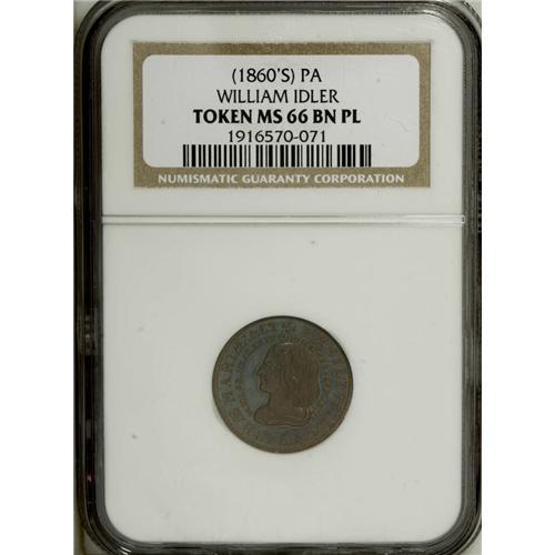 <B>(1860s) William Idler Dealer in Coins, Philadelphia, PA, Miller-Pa-217, MS66 Brown Prooflike NGC.</B></I> Copper. Famed Philadelphia collector-dealer William K. Idler and his son-in-law, Capt. John W. Haseltine, are two seminal figures in 19th century American numismatics. This is an exceptional deep chocolate-brown token that imitates a Lord Baltimore penny, accented with blue-green toning on prooflike fields. This high-end piece is one of the finest pieces graded of this token. Forget the catalog value on this fantastic example.<BR><BR><b>Shipping:</b> Coin/Currency (<a target="_blank" href="http://www.heritageauctions.com/common/shipping.php">view shipping information</a>)