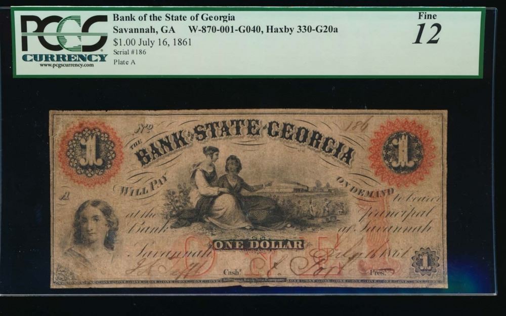 One 1861 $1 Bank of the State of Georgia Obsolete Note PCGS 12.