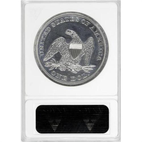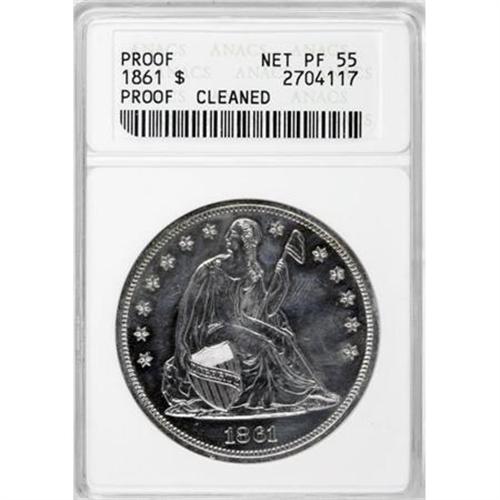 <B>1861 $1 --Cleaned--ANACS. Proof, Net PR55.</B></I> A sharply struck survivor that shows elements of cloudiness in the predominantly silver-white fields. Both sides show small points of contact and scattered hairlines as a result of a past cleaning.<BR><BR><B>Coin Engraver:</B> Christian Gobrecht<BR><BR><b>Shipping:</b> Coins & Currency (<a target="_blank" href="http://www.heritageauctions.com/common/shipping.php">view shipping information</a>)