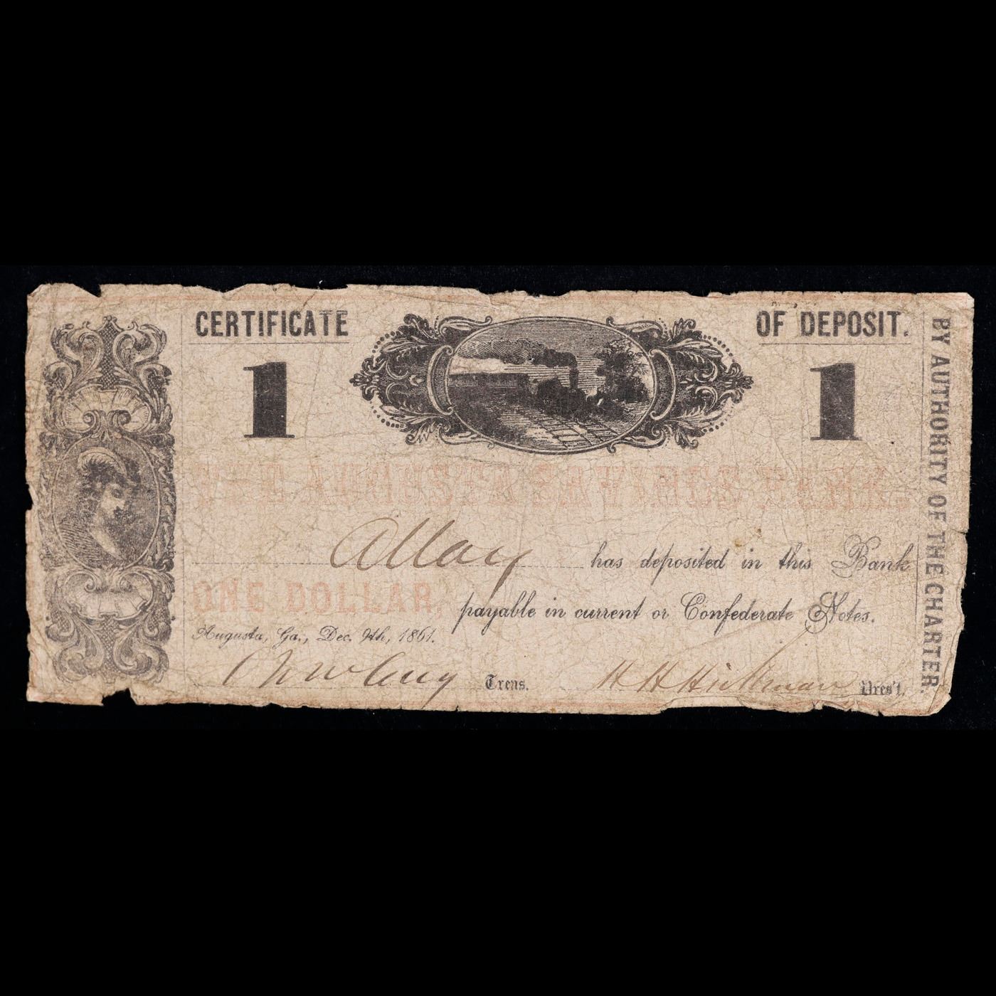 1861 $1 Deposit note Bank Of Augusta, Georgia Grades vg, very good