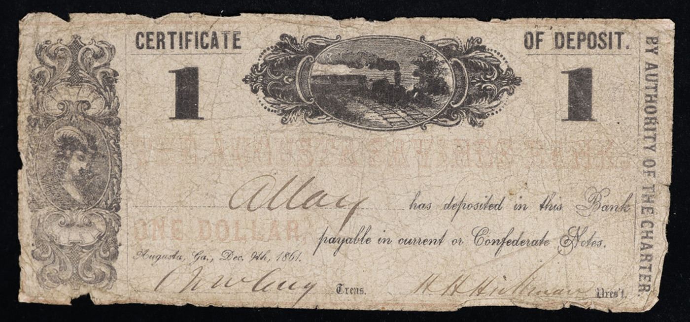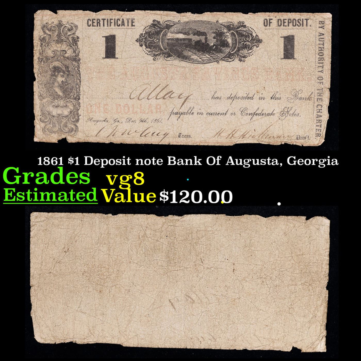 1861 $1 Deposit note Bank Of Augusta, Georgia Grades vg, very good.
