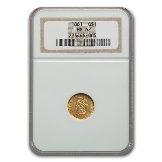 One piece 1861 $1 Indian Head Gold MS-62 NGC