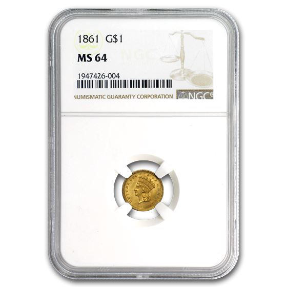 One piece 1861 $1 Indian Head Gold MS-64 NGC