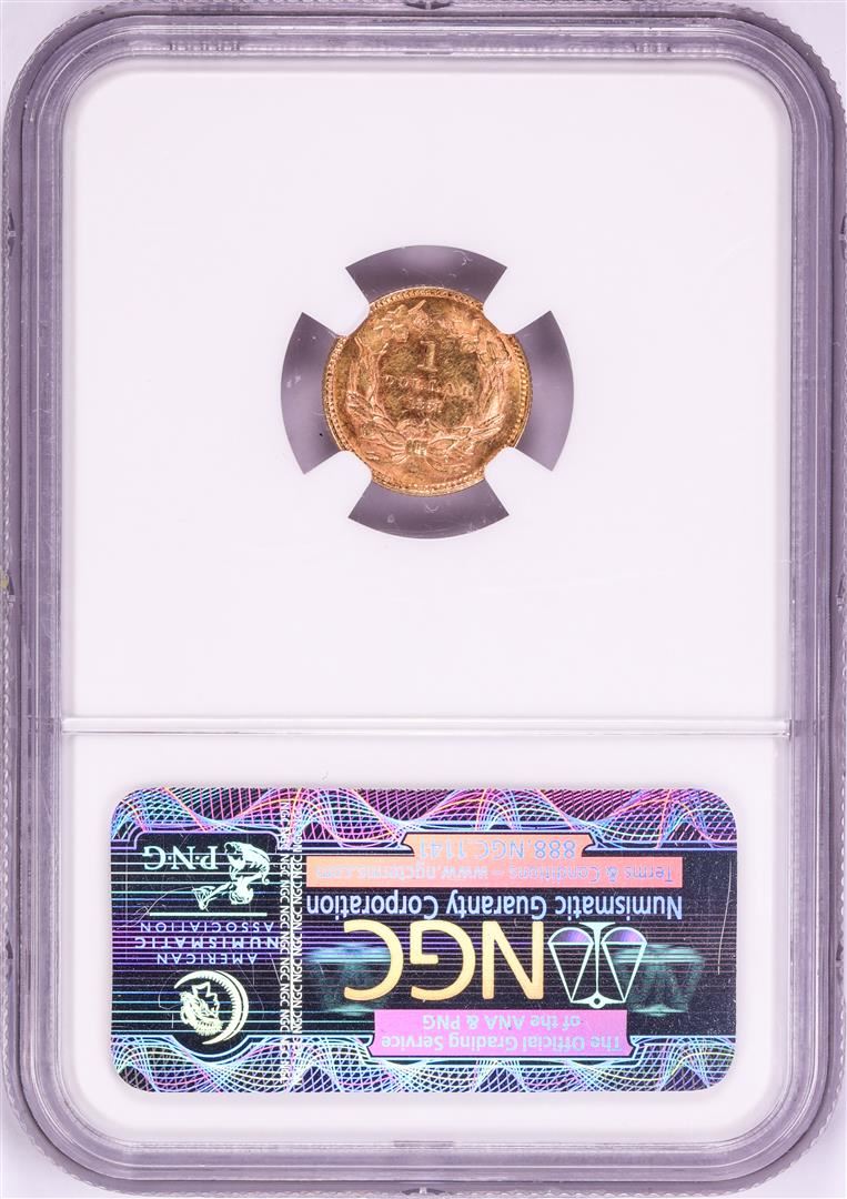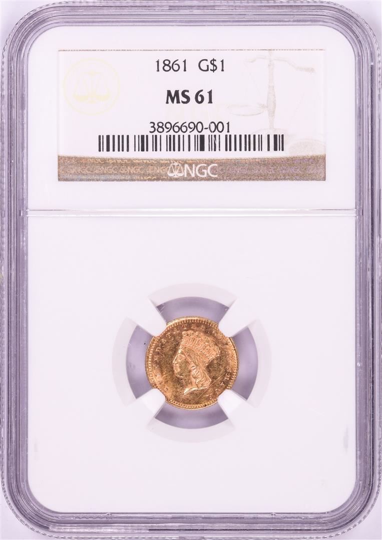 One 1861 $1 Indian Princess Head Gold Dollar Coin NGC MS61. NGC Certified.