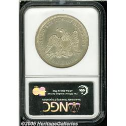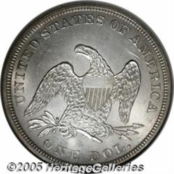 <B>1861<img border='0' src='http://www.heritagecoins.com/images/star.gif' width=10 height=10>$1 MS63 NGC.</B></I> As the Civil War got under way, the public in both the north and the south began hoarding precious metals. Silver dollars were not released into circulation at the time. Rather, they were actually sold by the Mint at 108 cents each, according to James Pollock in his annual Mint Report. In a commentary by R.W. Julian, it was noted that substantial melting of silver dollars occurred during this time, with at least 40,000 of these melted in 1861. This was so that they could be recoined into small denomination silver issues. The current example is sharply struck, displaying excellent definition in Liberty's hair and sandal, and on the eagle's talons. The surfaces are nearly white, revealing just a hint of incipient color. The only blemish on this appealing dollar is a small linear-type abrasion in the left reverse field. This coin generates great overall eye appeal.