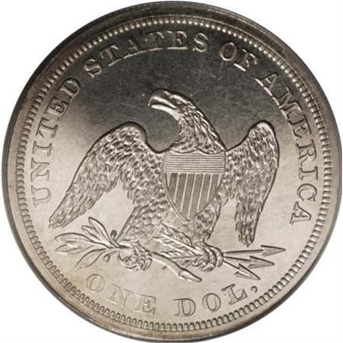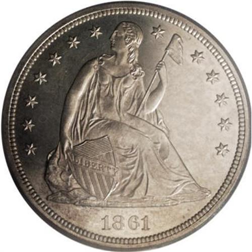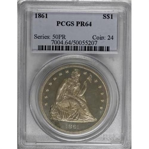<B>1861 $1 PR64 PCGS.</B></I> Business strikes coined during the Civil War are elusive, and in some cases major rarities, placing additional demand on the proofs that have survived through the years. This example is a pleasing example with light gold toning over silver surfaces. Population: 23 in 64, 7 finer (8/07).<I><BR>From The Beau Clerc Collection.</B></I><BR><BR><B>Coin Engraver:</B> Christian Gobrecht<BR><BR><b>Shipping:</b> Coins & Currency (<a target="_blank" href="http://www.heritageauctions.com/common/shipping.php">view shipping information</a>)