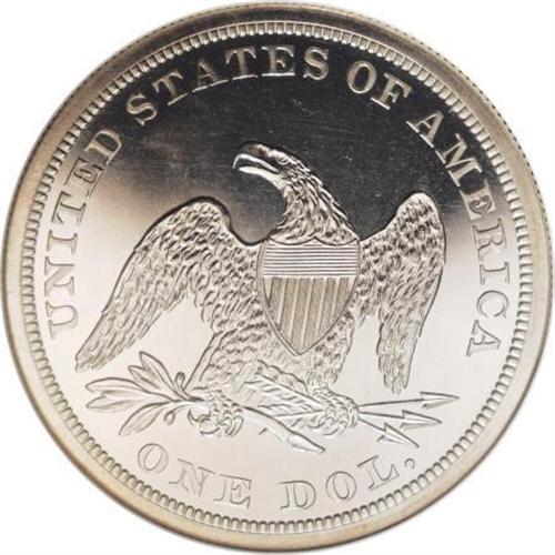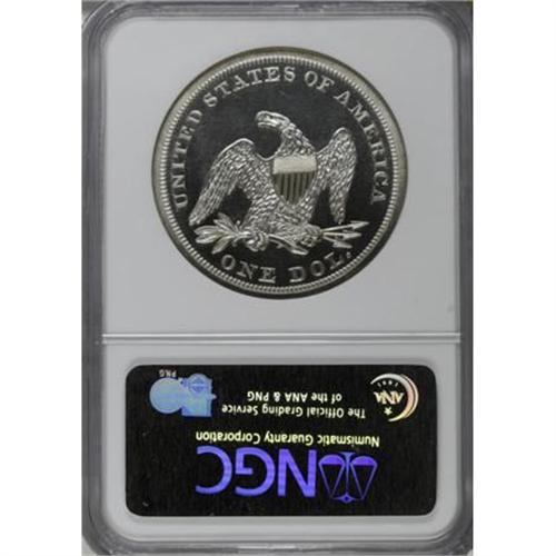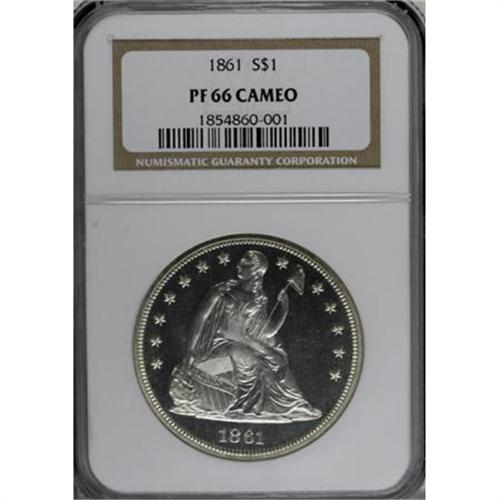 <B>1861 $1 PR66 Cameo NGC.</B></I> According to mint records, 1,000 proof silver dollars were minted in 1861, and all delivered on April 15 of that year. In his book <I>Silver Dollars and Trade Dollars of the United States</B></I>, David Bowers says that only about 350 were ever sold as part of copper-nickel and silver proof sets, and "... early in 1862 over 600 sets were consigned to the melting pot." Bowers goes on to say: "Today, 1861 Proof dollars are very elusive. Not only was the distribution low ... but those sold seem to have had an unusually high attrition rate." NGC/PCGS population figures show that about 180 coins have been certified, some of which, of course, are likely to be resubmissions. Fewer than 30 Cameo have been seen.<BR> The Premium Gem Cameo in this lot is essentially untoned, and its frosty motifs sit amidst deeply mirrored fields. The strike is outstanding, leaving none of the design elements with even a hint of weakness. A few wispy hairlines in the fields show up under high magnification, and prevent a possibly even higher grade! No pieces have been graded higher by either NGC or PCGS. Census: 2 in 66 Cameo, 0 finer (8/07).<BR><BR><b>Shipping:</b> Coins & Currency (<a target="_blank" href="http://www.heritageauctions.com/common/shipping.php">view shipping information</a>)