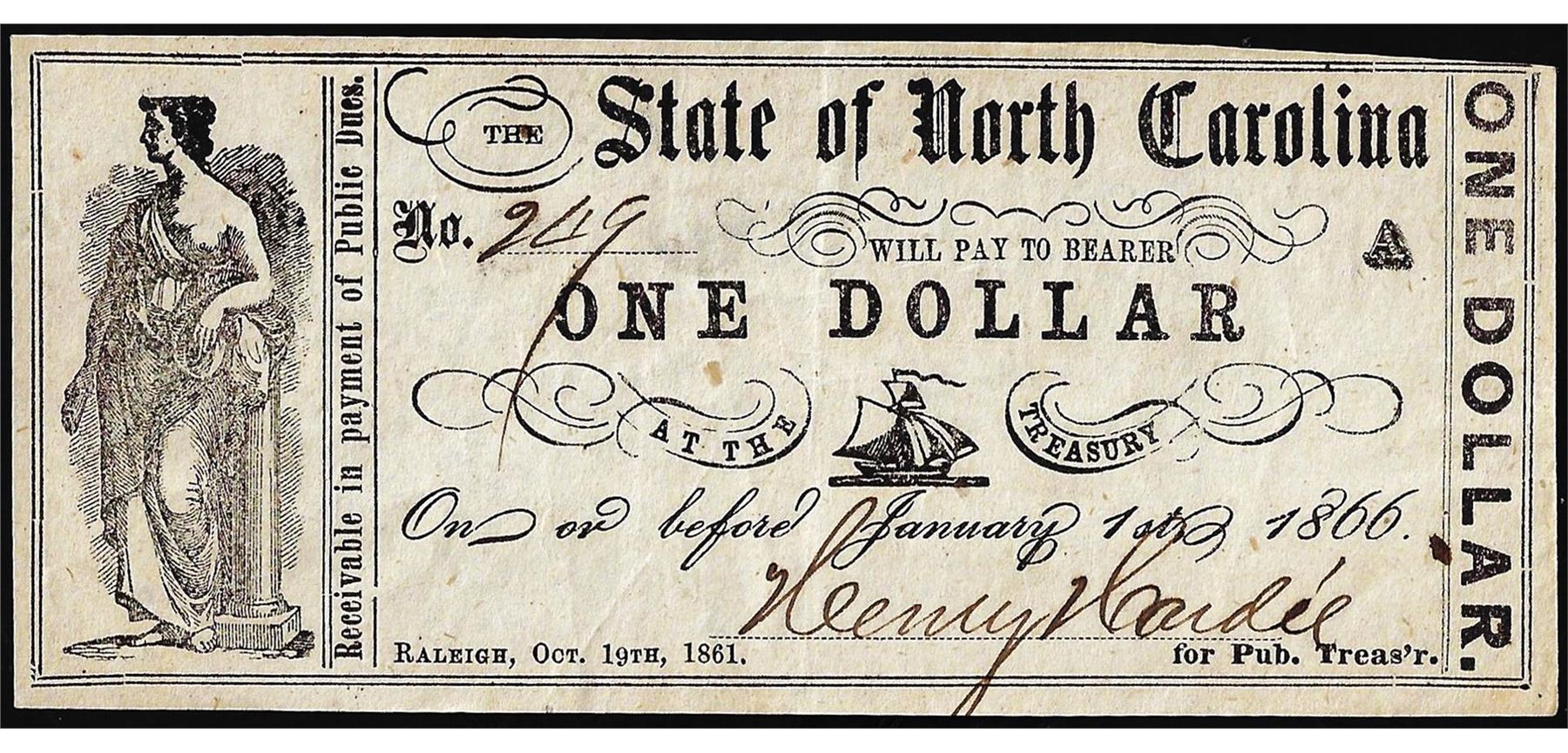 One 1861 $1 State of North Carolina Raliegh Obsolete Note.