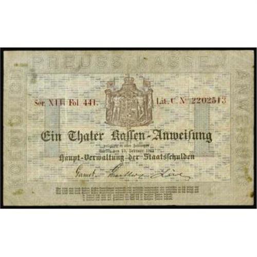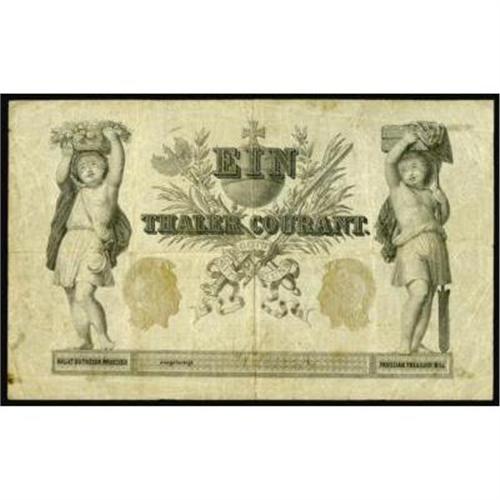 <style type="text/css"> body, td, th { font-family: Arial, Helvetica, sans-serif; font-size: 12px; color: #482424; margin: 0px; padding: 0px; } #header { background-image: url(http://www.bowersandmerena.com/ebay/images/template_v3_01.gif); clear: both; background-color: #590303; border-top-width: 2px; border-top-style: solid; border-top-color: #B38C4F; } #header #header_wrapper { height: 75px; clear: both; width: 800px; margin-right: auto; margin-left: auto; background-image: url(http://www.bowersandmerena.com/ebay/images/template_v3_03.gif); background-repeat: no-repeat; background-position: right; color: #F3EDCC; } #header #header_wrapper #header_logo { float: left; height: 75px; width: 444px; background-image: url(http://www.bowersandmerena.com/ebay/images/template_v3_02.gif); background-repeat: no-repeat; font-size: 10px; text-transform: capitalize; color: #B38C4F; } #header #header_wrapper #header_right { float: left; height: 75px; width: 356px; text-align: right; } #header #header_wrapper #header_right #headerLoginBtn { margin-bottom: 30px; } #header #header_wrapper #header_right input#txtSearch { color: #B49056; border: 1px solid #B49056; width: 175px; padding-top: 3px; padding-right: 3px; padding-bottom: 4px; padding-left: 3px; } #nav { height: 37px; background-image: url(http://www.bowersandmerena.com/ebay/images/template_v3_05.gif); clear: both; } #nav #nav_wrapper { height: 35px; width: 800px; margin-right: auto; margin-left: auto; border-left-width: 1px; border-left-style: solid; border-left-color: #B38C4F; } #nav #nav_wrapper a { padding-right: 15px; padding-left: 15px; border-right-width: 1px; border-right-style: solid; border-right-color: #B38C4F; height: 25px; padding-top: 10px; display: block; float: left; text-decoration: none; font-weight: bold; color: #5D0303; } #nav #nav_wrapper a:hover { color: #B38C4F; } #nav #nav_wrapper #search { float: right; padding-top: 7px; } #nav #nav_wrapper #search #txtSearch { font-family: Arial, Helvetica, sans-serif; font-size: 10px; text-transform: uppercase; color: #D2AE75; border: 1px solid #B38C4F; padding: 3px; } #content_bgd { background-image: url(http://www.bowersandmerena.com/ebay/images/template_v3_09.gif); background-repeat: repeat-y; background-position: center; padding-top: 15px; padding-bottom: 15px; background-color: #FBFBDB; } #content_wrapper { clear: both; height: auto; width: 800px; margin-right: auto; margin-left: auto; } .LotDetailWhite { line-height:normal; font-size:13px; font-family: arial,helvetica,sans-serif; color: White; font-weight: bold; } .LotDetailInformation { line-height:normal; font-size: 13px; font-family: arial,helvetica,sans-serif; } .LotDetailMessage { line-height:normal; font-size: 13px; font-family: arial,helvetica,sans-serif; color: red; } } tr.HeaderAuctionTitle td { color: #000000; font-weight: bold; padding: 2px; background-image: url(http://www.bowersandmerena.com/ebay/images/template_v3_05.gif); background-repeat: repeat-x; border-bottom-width: 1px; border-bottom-style: solid; border-bottom-color: #B38C4F; } table.AuctionSummary a, table.AuctionSummary a:link, table.AuctionSummary a:visited { color: #0000FF; text-decoration: none; } } td.tableHeaderLeft { border-left-width: 1px; border-left-style: solid; border-left-color: #B38C4F; } td.tableHeaderRight { border-right-width: 1px; border-right-style: solid; border-right-color: #B38C4F; } td.tableCellMiddle { border-left-width: 1px; border-left-style: solid; border-left-color: #B38C4F; border-right-width: 1px; border-right-style: solid; border-right-color: #B38C4F; padding: 5px; } tr.footer td { border-top-width: 1px; border-top-style: solid; border-top-color: #B38C4F; } </style> </head> <body> <div id="header"> <div id="header_wrapper"> <div id="header_logo"> </div> <div id="header_right"> </div> </div> </div> <div id="nav"> <div id="nav_wrapper"> <a href="http://www.bowersandmerena.com">Our eBayLive Auctions</a> <a href="#PaymentInfo">Payment Information</a> <a href="#ShippingInfo">Shipping Information</a> <a href="#About">About Bowers and Merena</a> </div> </div> <div id="content_bgd"> <div id="content_wrapper"> <table width="100%" border="0" cellpadding="5" cellspacing="0" class="AuctionSummary"> <tbody> <tr class="HeaderAuctionTitle" style="height: 25px;"> <td align="left" class="tableHeaderLeft" > </td> <td align="center" class="tableHeaderRight"> <span style="font-size: large;">Lot #2818. Specialized Germany. 1861 1 Thaler. Main Administration of Government Debts. Very Fine.</span> </td> </tr> <tr> <td colspan="3" class="tableCellMiddle"> PS-411. This note was created in response to the counterfeiting of the older issue. The engravers designed the new bill with the word "treasury" in English to thwart the problem. This piece is a great example with a nice multi-colored miniature text as a underprint. The note has even circulation which provides a nice look.