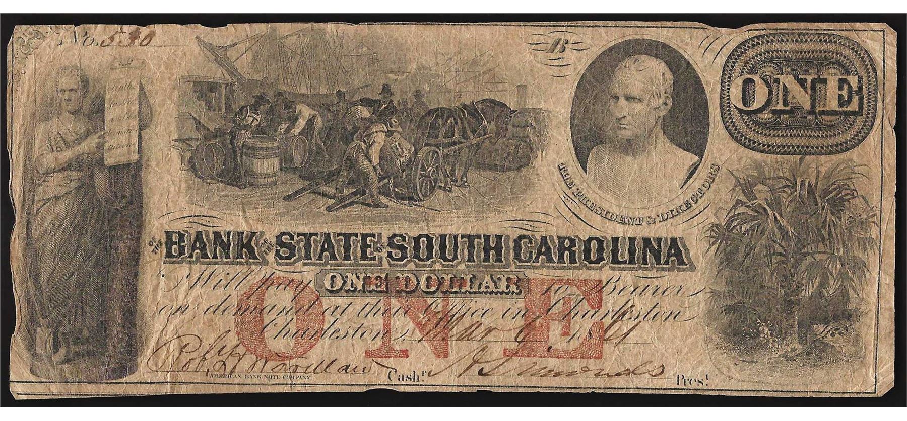 One 1861 $1 The Bank of the State South Carolina Obsolete Note.