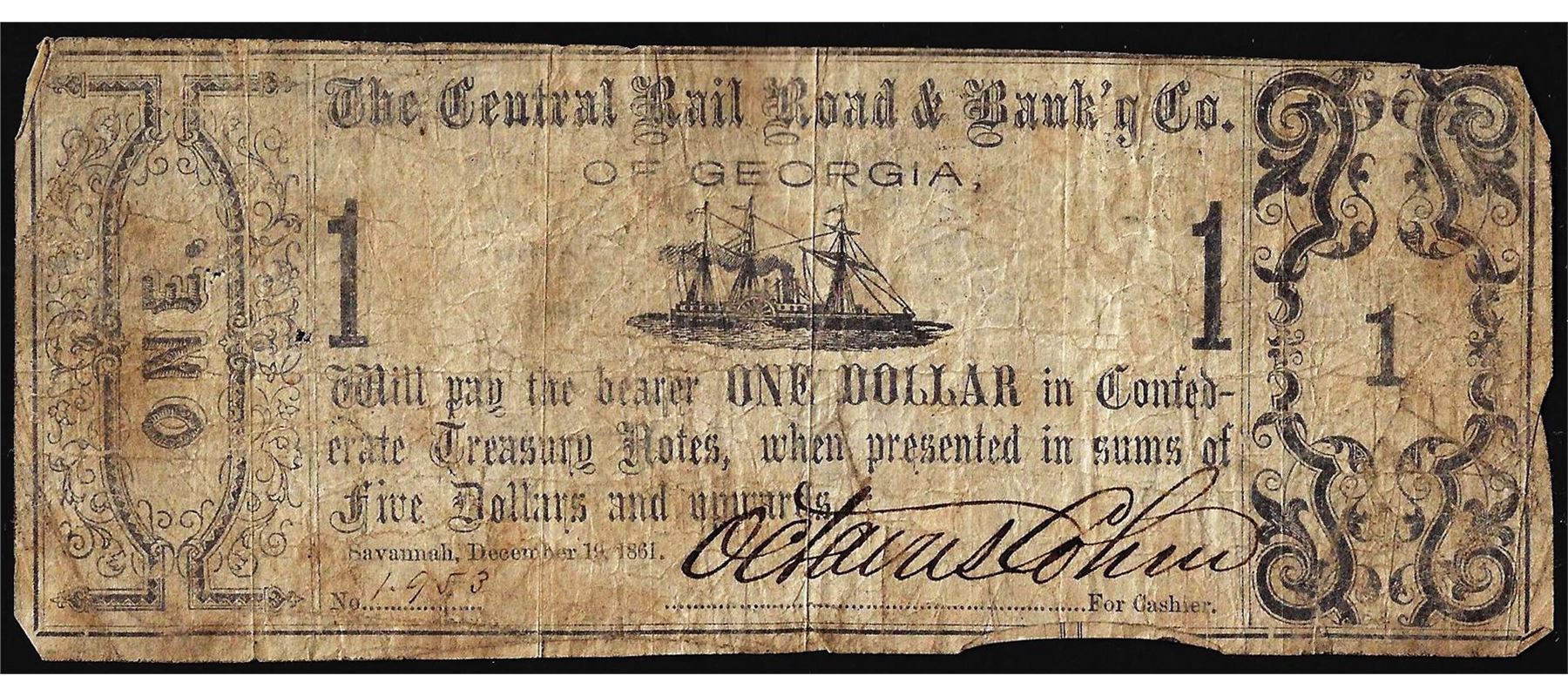 One 1861 $1 The Central Rail Road & Bank'g Co Savannah, Georgia Obsolete Banknote.