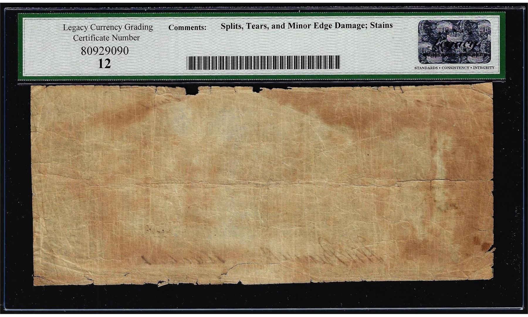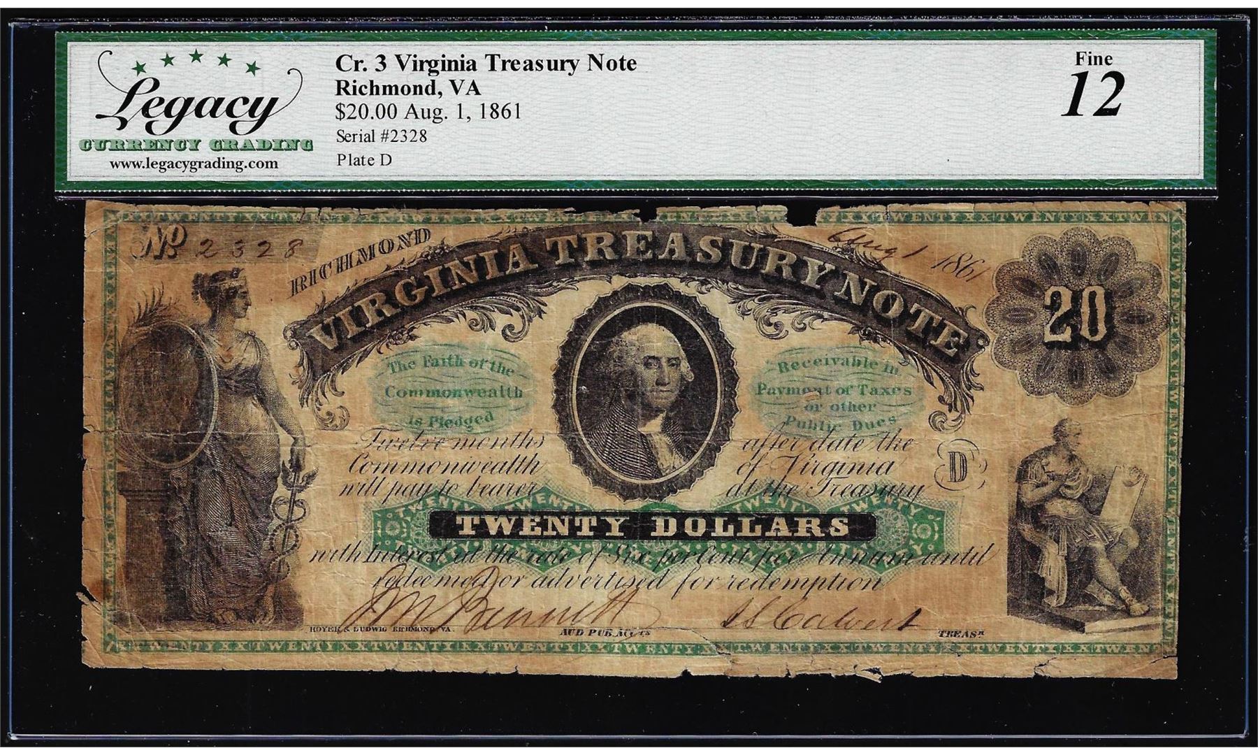 One 1861 $1 Virginia Treasury Note Richmond, VA Obsolete Note Legacy Fine 12. Legacy Graded.