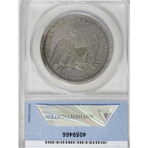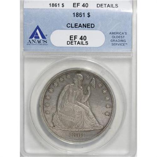 <B>1861 $1 --Cleaned--ANACS. XF40 Details.</B></I> Only light actual wear is present, but the slate-gray surfaces are thickly hairlined, and scattered small marks are typical of a limited stint in commerce. A popular Civil War date.<BR><BR><B>Coin Engraver:</B> Christian Gobrecht<BR><BR><b>Shipping:</b> Coins & Currency (<a target="_blank" href="http://www.heritageauctions.com/common/shipping.php">view shipping information</a>)