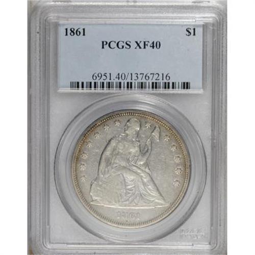 <B>1861 $1 XF40 PCGS.</B></I> This slate-gray silver dollar lacks mentionable marks, and luster emerges from the plumage, legends, and drapery. Only 77,500 pieces were struck for this difficult Civil War date.<BR><BR><B>Coin Engraver:</B> Christian Gobrecht<BR><BR><b>Shipping:</b> Coins & Currency (<a target="_blank" href="http://www.heritageauctions.com/common/shipping.php">view shipping information</a>)