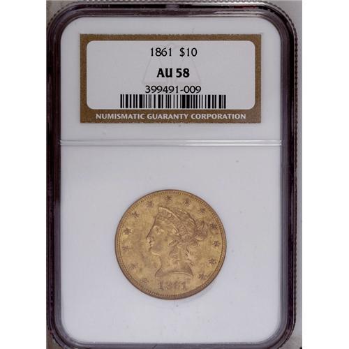 <B>1861<$10> AU58 NGC.</B></I> Bulging or six-fold bun subtype. This dusky tan-gold Civil War eagle has an original appearance and a crisp strike. Distributed small marks are unavoidable for the grade, but are fewer in number and less in severity than usually seen.