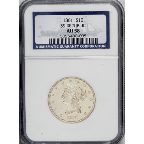 <B>1861<$10> AU58 NGC.</B></I> Ex: S.S. Republic. The sharpness is Mint State, but the luster is subdued. Only one apparent mark, located on Liberty's shoulder. The "Bulging Bun" subtype with six-folds in the bun. The 1861 is the only available Liberty eagle issue from the 1860s, and is also popular for its Civil War date. Along with the lot is a presentation wooden box with booklet, DVD, coin, and COA.