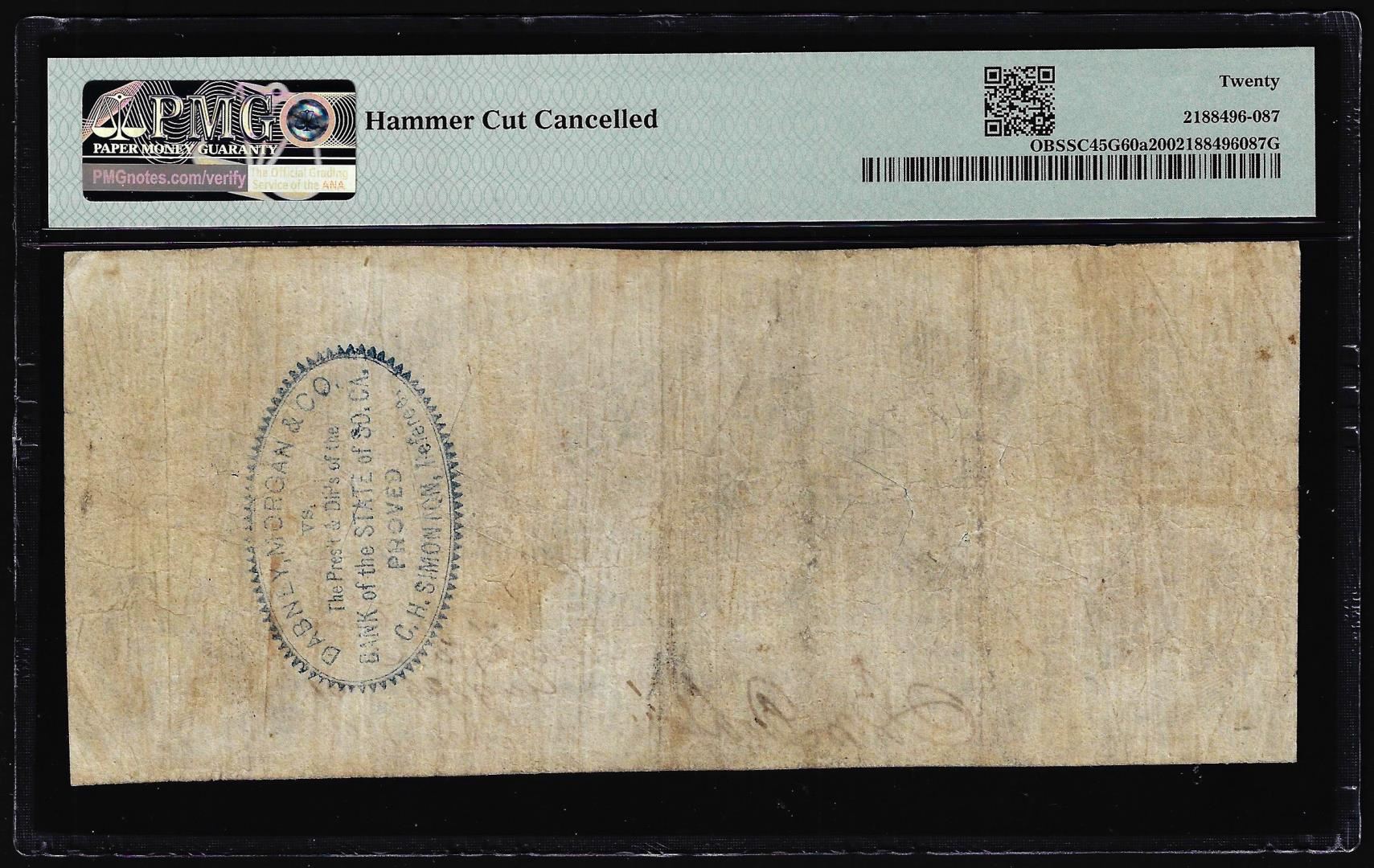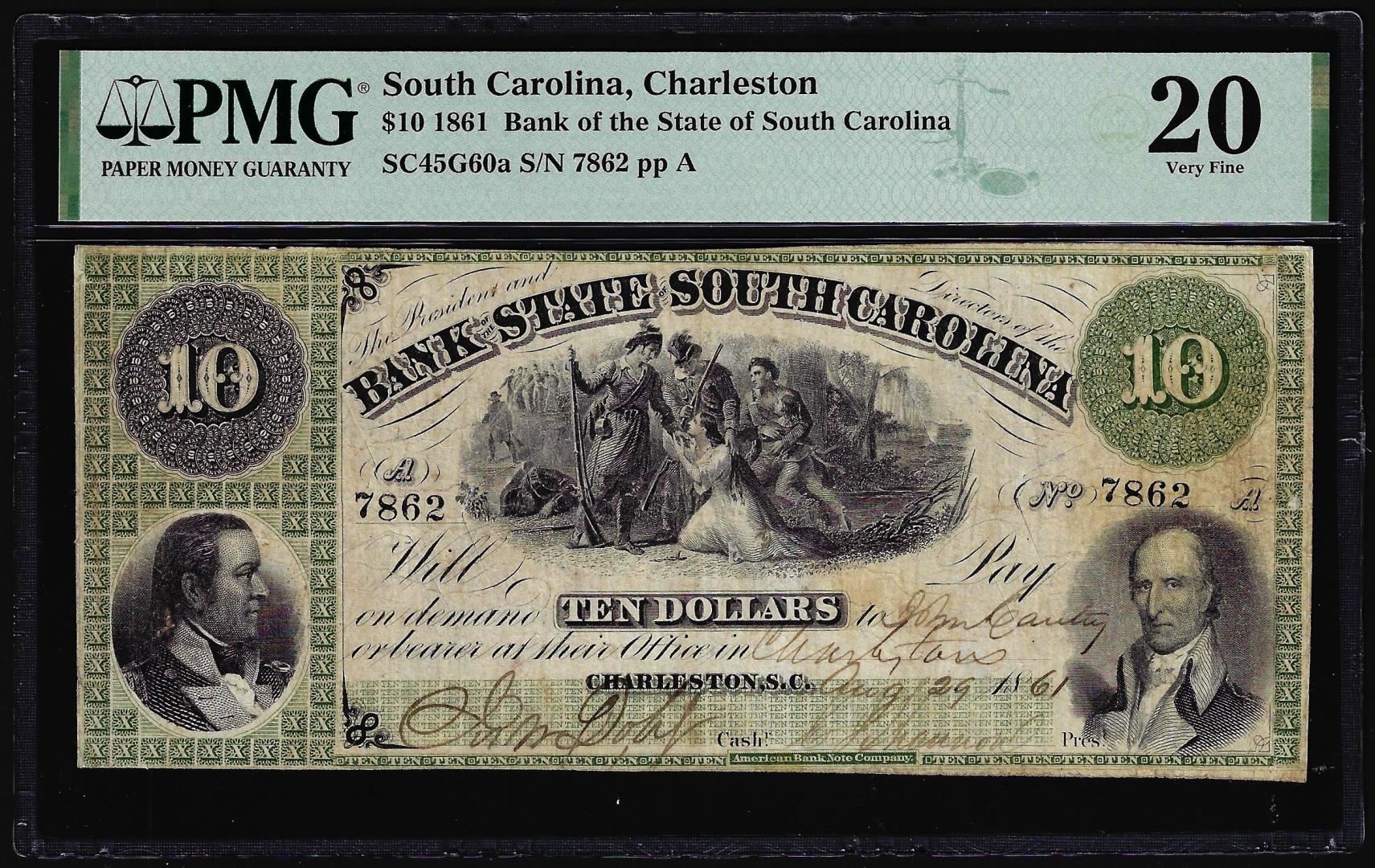 One 1861 $10 Bank of the State of South Carolina Obsolete Note SC45G60a PMG Very Fine 20. PMG Certified.