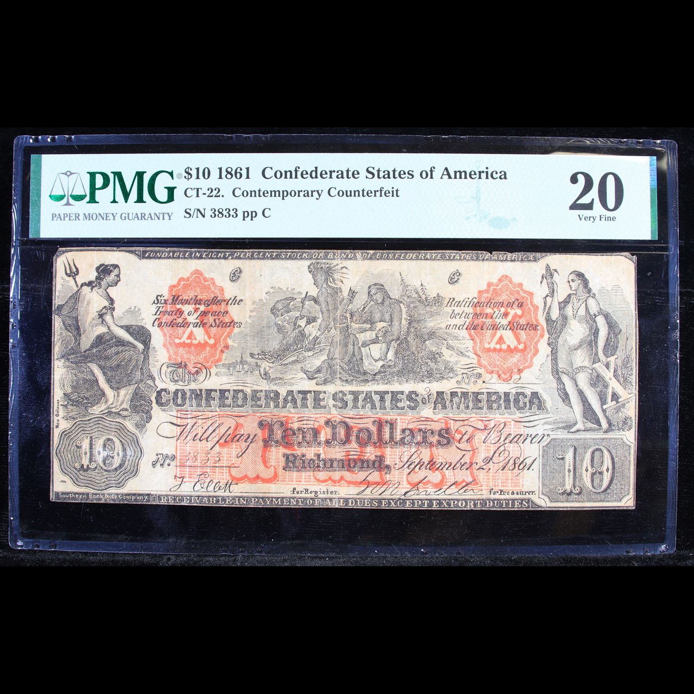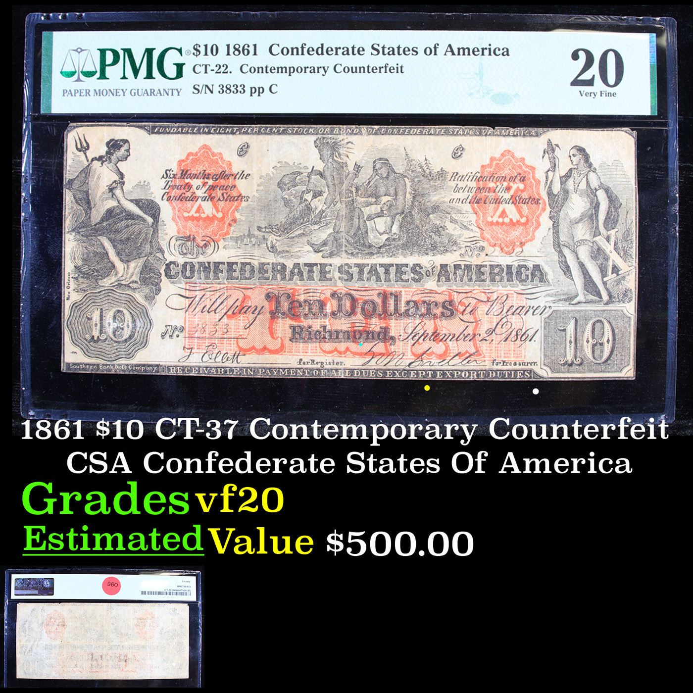 1861 $10 CT-37 Contemporary Counterfeit CSA Confederate States Of America Graded vf20 By PMG. Contemporary counterfeit coins Or Currency are fakes made for the purpose of passing in everyday commerce at face value. Contemporary counterfeits were made during the same time period (hence, contemporary) as the genuine government-issues they attempt to mimic. They are, therefore, as much a part of numismatic history as the coins they imitate. It is largely for this reason that contemporary counterfeits recently have seen a rise in interest for certain countries and series, accompanied by a corresponding increase in prices for certain pieces.