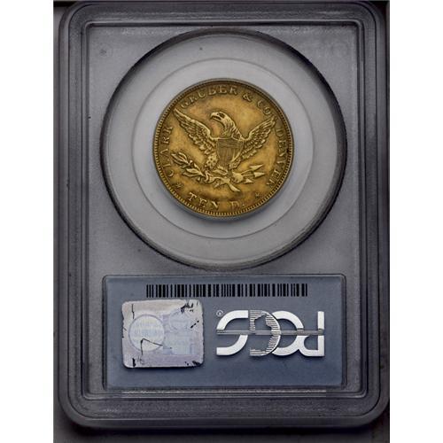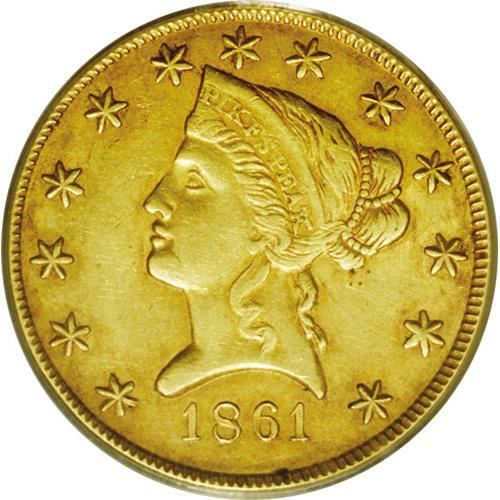 <B>1861<$10> Clark, Gruber & Co. Ten Dollar AU55 PCGS.</B></I> K-7, R.4. An aesthetically pleasing representative of this scarce type, both sides display rich green-gold color with warm reddish-gold overtones at the central portion of the reverse. Both sides are uncommonly smooth for a circulated Territorial ten, although we do note a few wispy hairlines mostly confined to the obverse. Well struck with light softness of detail confined to the usually seen areas: the top of Liberty's portrait and the lower reverse eagle. Listed on page 363 of the 2006 <I>Guide Book.</B></I>