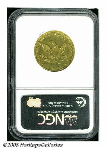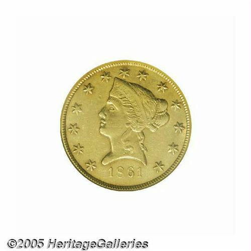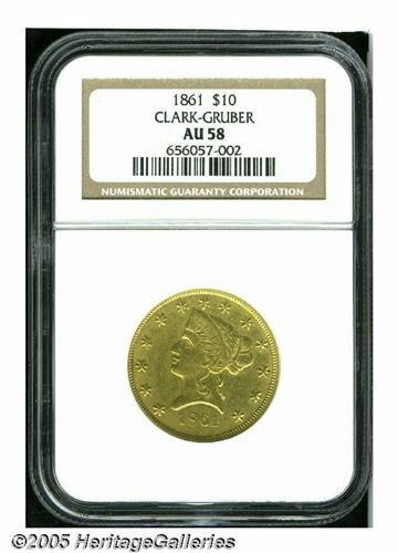 <B>1861<$10> Clark, Gruber & Co. Ten Dollar AU58 NGC.</B></I> K-7, R.4. A canary-gold representative, the fields are gently reflective and the eagle's wings are exquisitely detailed. Kagin mentions concerning the variety, "Back of head, claws, and stem weak," which correctly lists the only areas of the coin (other than the eagle's legs) that are not boldly defined. A series of small planchet flaws, as made, are noted on the arrowheads, and a retained lamination, as produced, is found beneath the left (facing) eagle's wing. Surprisingly unmarked for a briefly circulated Ten Dollar piece, a horizontal slide mark below the mouth is hardly worthy of mention. Listed on page 309 of the 2005 <I>Guide Book.</B></I><BR><I>From The Great Western Collection of Territorial Gold.</B></I>