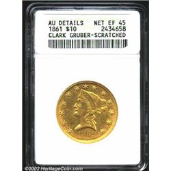 1861 $10 Clark, Gruber & Co. Ten Dollar--Scratched--ANACS. AU Details, Net XF45. K-7, R.4. The amount of remaining definition and the scarcity of this issue are the most important features of this AU survivor. The definition is relatively sharp over all areas save for the lower eagle. Both sides are curiously glossy in sheen with color that alternates between green-gold and yellow-gold shades depending on the light angle. There are some wispy abrasions throughout, and a few scratches are noted over and before Liberty's chin. This Colorado issue is listed on page 302 of the 2002 Guide Book.From The Estate of Jack L. Klausen. Important notice: We expect to be auctioning lots at the rate of 200-250 per hour. Sometimes eBay Premier live bid software cannot keep up with that pace, so we strongly recommend that you place a realistic proxy bid now as insurance to avoid disappointment. Also please note that all Heritage/CAA lots purchased through eBay Premier carry a 20% Buyer's Premium. Please make sure you read the Terms and Conditions.