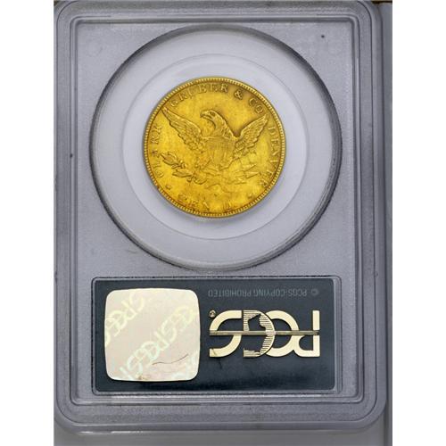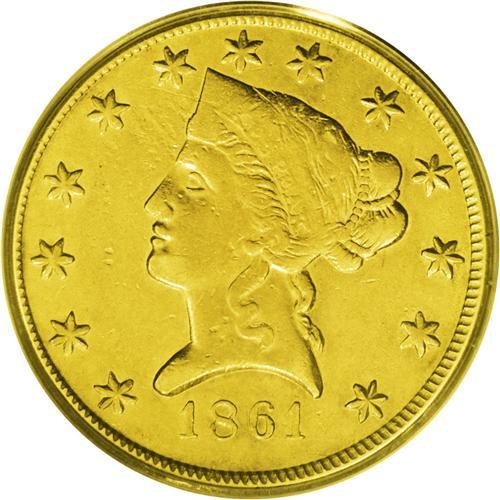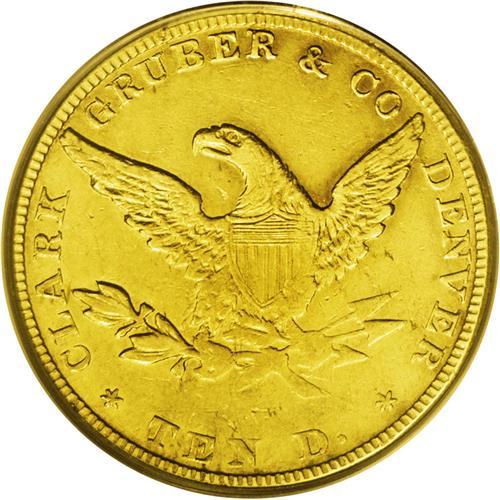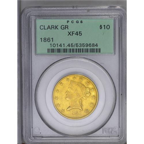 <B>1861<$10> Clark, Gruber & Co. Ten Dollar XF45 PCGS.</B></I> K-7, R.4. For the second and final year of private Clark, Gruber & Co. coinage, the depiction of Pike's Peak on the ten and twenty dollar pieces was abandoned in favor of imitations of Federal types. Portions of the designs are softly struck, and shallow strike-throughs are noted near the forehead, but the remaining luster is extensive, and no distracting marks are found. Certified in a green label holder.<BR><I>From The Carolina Gold Collection, Part Four.</B></I>