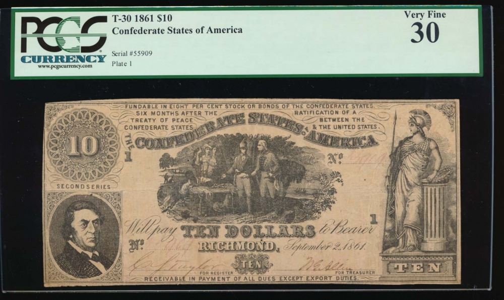 One 1861 $10 Confederate States of America Note PCGS 30.