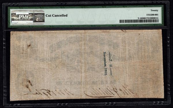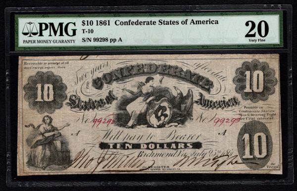 One 1861 $10 Confederate States of America Note PMG 20.