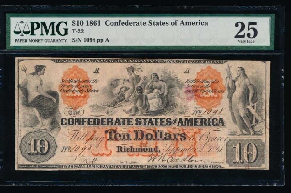 One 1861 $10 Confederate States of America Note PMG 25.