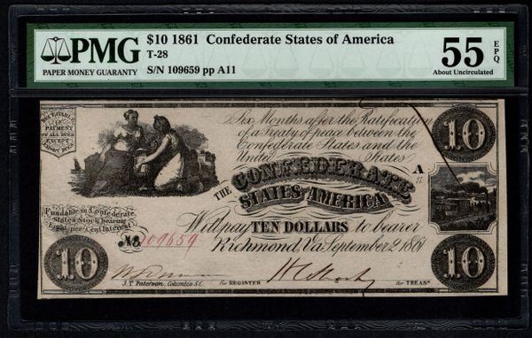 One 1861 $10 Confederate States of America Note PMG 55EPQ.
