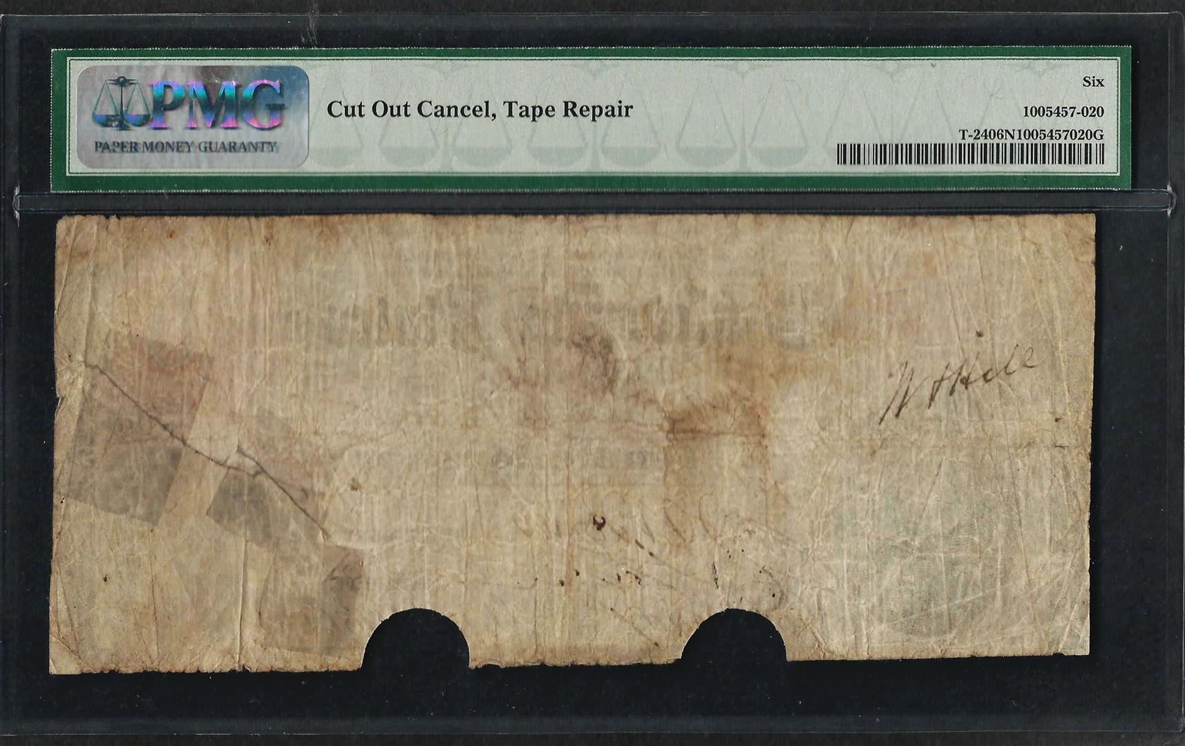 One 1861 $10 Confederate States of America Note T-24 PMG Very Good 6 Net Canceled. PMG Certified.