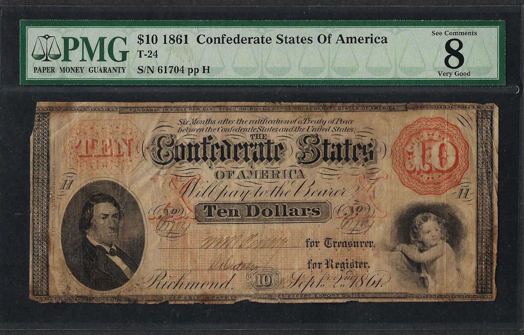 1861 $10 Confederate States of America Note T-24 PMG Very Good 8 Canceled