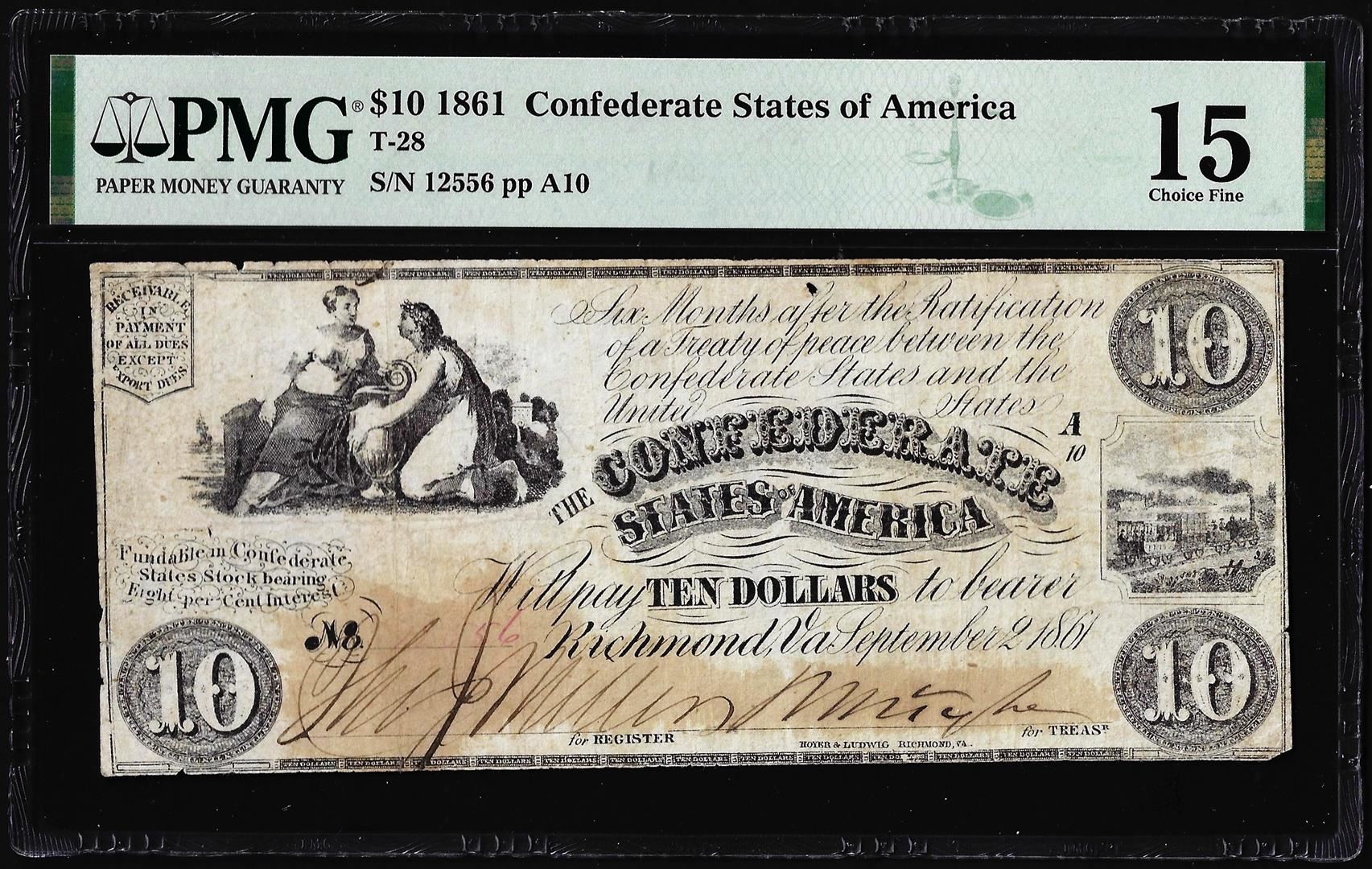 One 1861 $10 Confederate States of America Note T-28 PMG Choice Fine 15. PMG Certified.