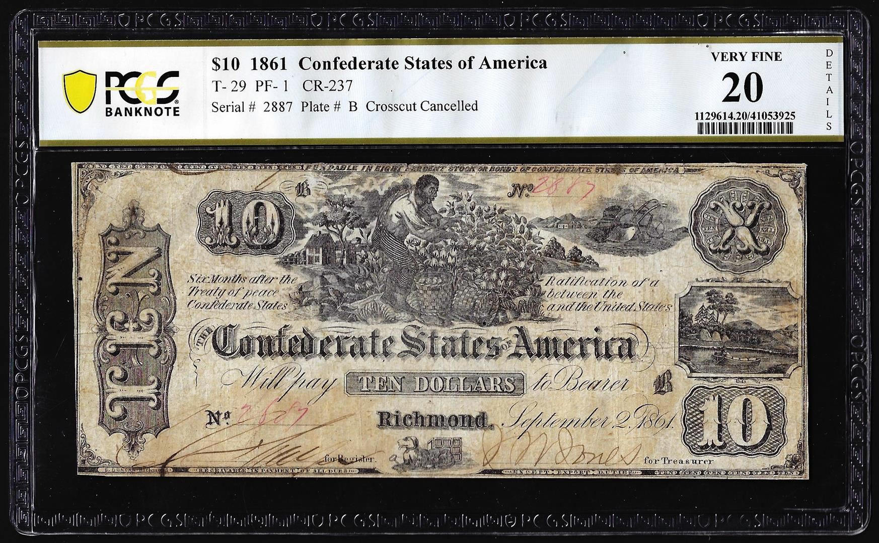 1861 $10 Confederate States of America Note T-29 PF-1 PCGS Very Fine 20 Details