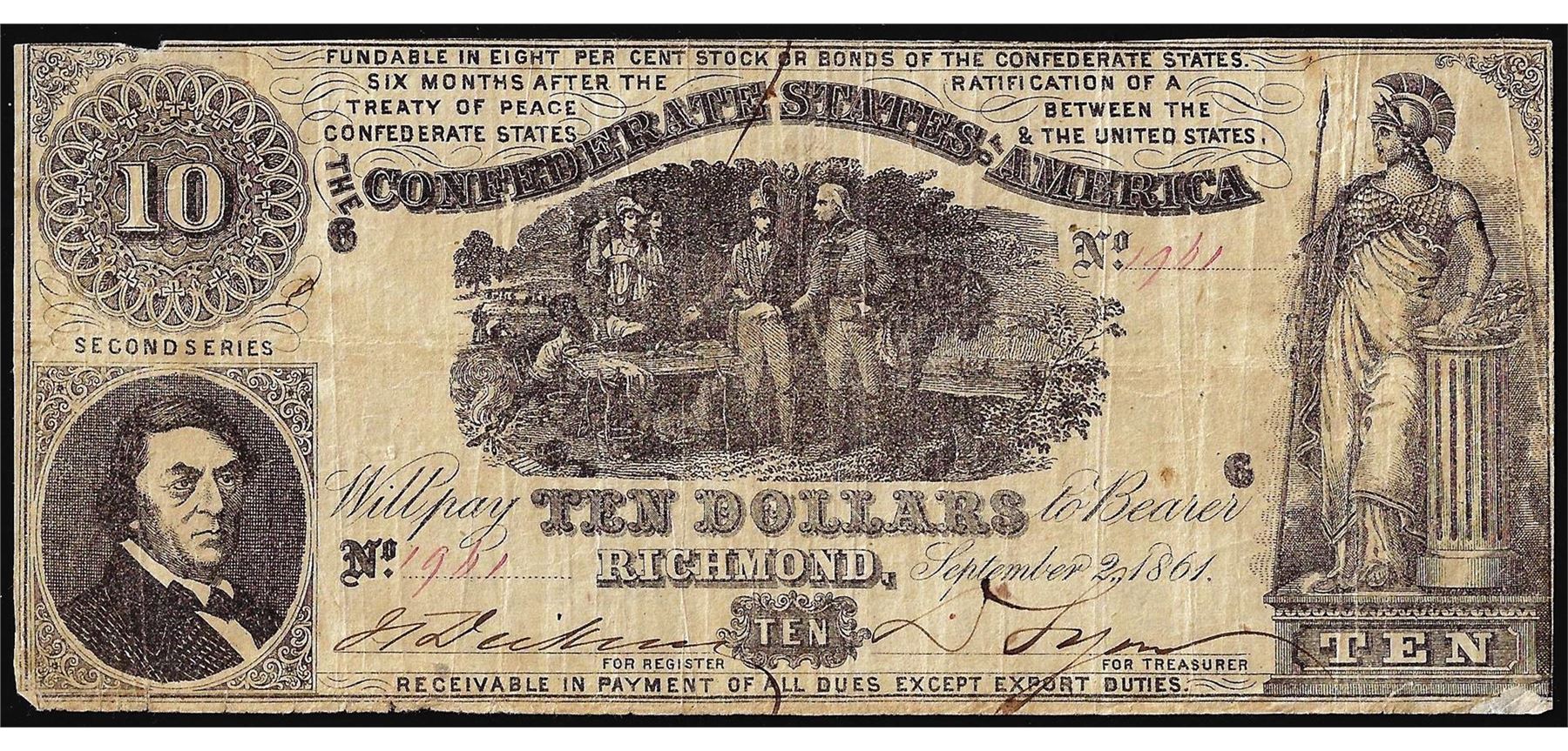 One 1861 $10 Confederate States of America Note.