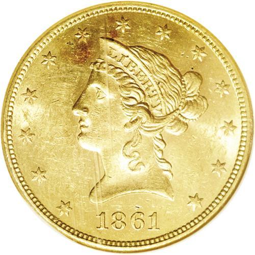 <B>1861<$10> MS61 NGC.</B></I> Crisply struck with appealing yellow-gold color that is interrupted by minor alloy stains by stars 6 and 7. While the luster is unbroken, numerous abrasions in the fields contribute to the modest Mint State rating on this popular No Motto eagle. Census: 24 in 61, 13 finer (3/06). <BR><BR><B>Important notice:</B> Heritage usually auctions material at the rate of 200-250 lots per hour. On some occasions eBay Live bid software or the Internet may not be able to keep up with the pace of the auction. We recommend placing a realistic absentee bid now as insurance to avoid disappointment. Occasionally the auctioneer may eliminate or reject an eBay Live bid, and the auctioneer may also reopen a lot after the close of the eBay live bidding (usually because we missed an audience bid), and may reject your bid even if it shows you as the winning bidder. By bidding via eBay Live, you agree that Heritage may award the lot to another bidder at its sole discretion under the circumstances described above or any other reasonable circumstances. Since eBay bids are not shown to us until we open the lot on the floor, we treat those bids just like floor bids. In most cases the floor responds before the eBay bid is presented to us, due to Internet lag time, so for consistency we have made it a policy that floor bids are always considered first over tie eBay live bids. Also please note that all Heritage lots purchased through eBay Live carry a 20% Buyer's Premium. Please make sure you read the Terms and Conditions before you bid. This lot is being auctioned in conjunction with a live floor auction by Heritage Galleries & Auctioneers. All final auction and invoice information will be supplied by Heritage Galleries & Auctioneers, and all other information should be considered preliminary. Lot:3956 <BR><BR><B>Winning Notification and Billing:</B> After the FINAL session in this auction is complete, Heritage will send e-mail and snail mail invoices. This process normally takes several days. All final auction and invoice information will be supplied by Heritage Galleries & Auctioneers, and all other information should be considered preliminary. <BR><BR>This auction will be conducted on a live auction floor and over the Internet through eBay Live. If you choose to place an absentee bid, please take a moment to <font color='#0000ff'><u><a href='http://pages.ebay.com/liveauctions/help/before/laabsentee.html'>learn how eBay Live absentee bidding works</a></u></font><font color='#000000'>