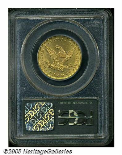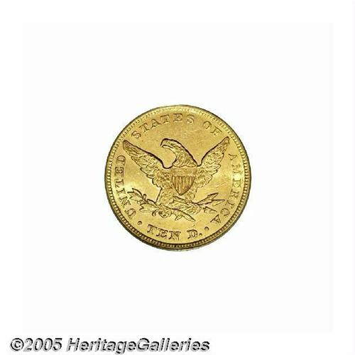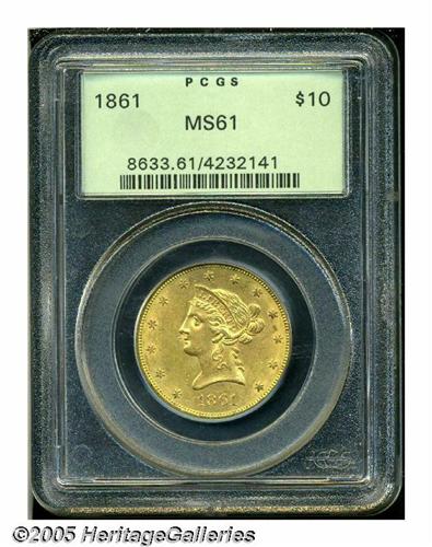 <B>1861<$10> MS61 PCGS.</B></I> Original honey toning graces this well struck representative. A few marks are distributed, but none offend the eye. The most available issue from the 1860s, the 1861 is nonetheless a rarity in Mint State. The six-fold or bulging bun subtype, which should perhaps be designated as Type Two since it was used for the remainder of the series. Encapsulated in a green label holder. Population: 14 in 61, 6 finer (6/05).
