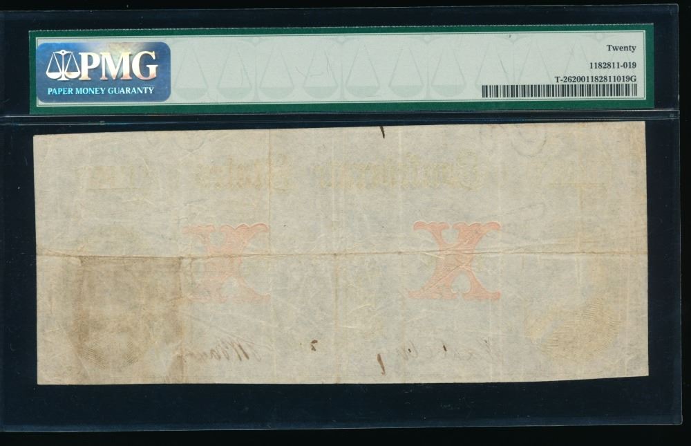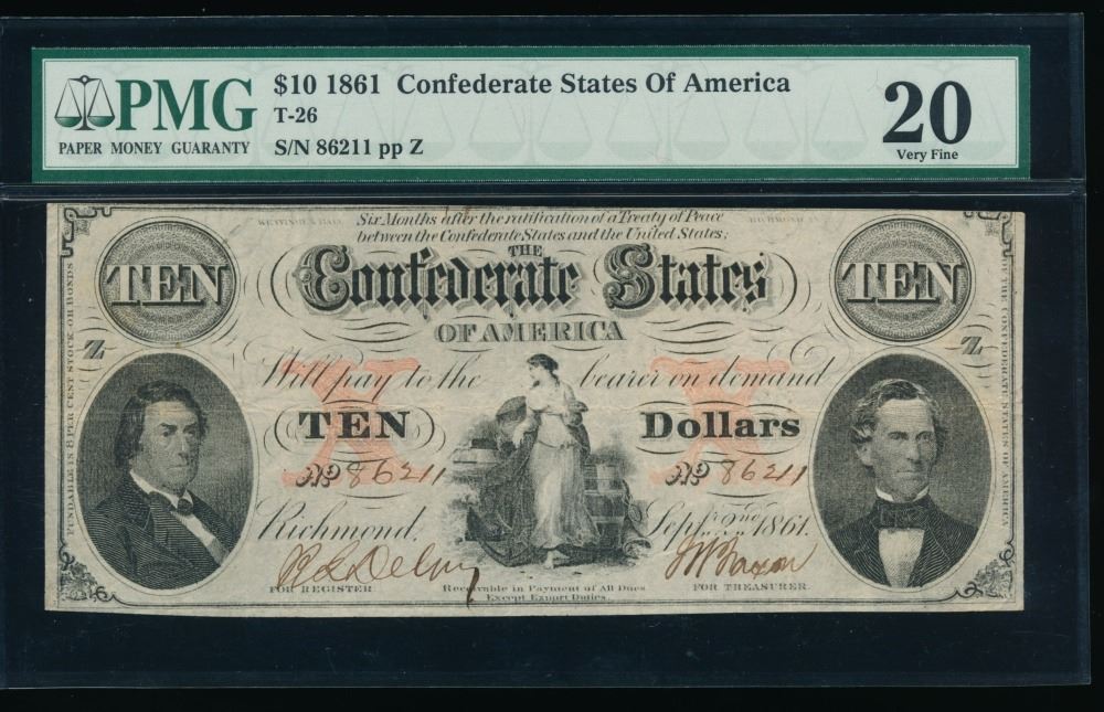 One 1861 $10 T-26 Confederate PMG 20.