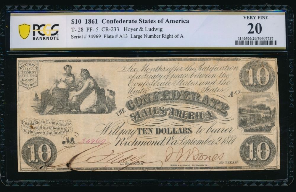 One 1861 $10 T-28 Confederate PCGS 20.