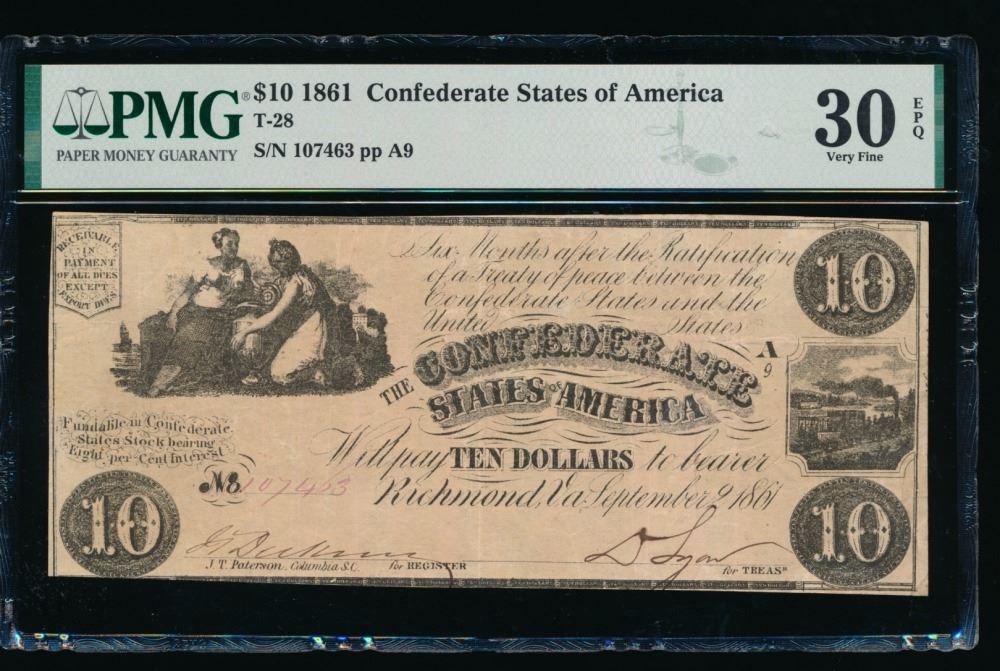 One 1861 $10 T-28 Confederate PMG 30EPQ.